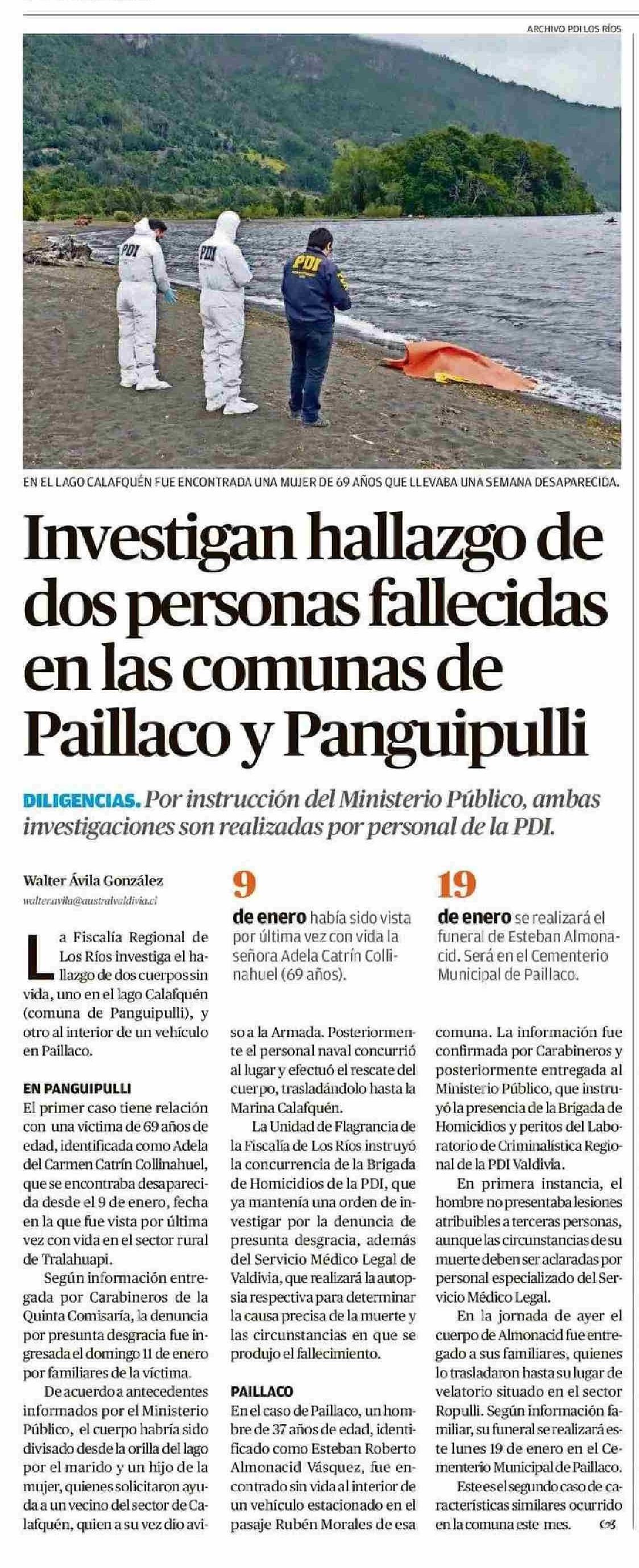 Investigan hallazgo de dos personas fallecidas en las comunas de Paillaco y Panguipulli 18-01-2026 Diario Austral Región de Los Ríos |