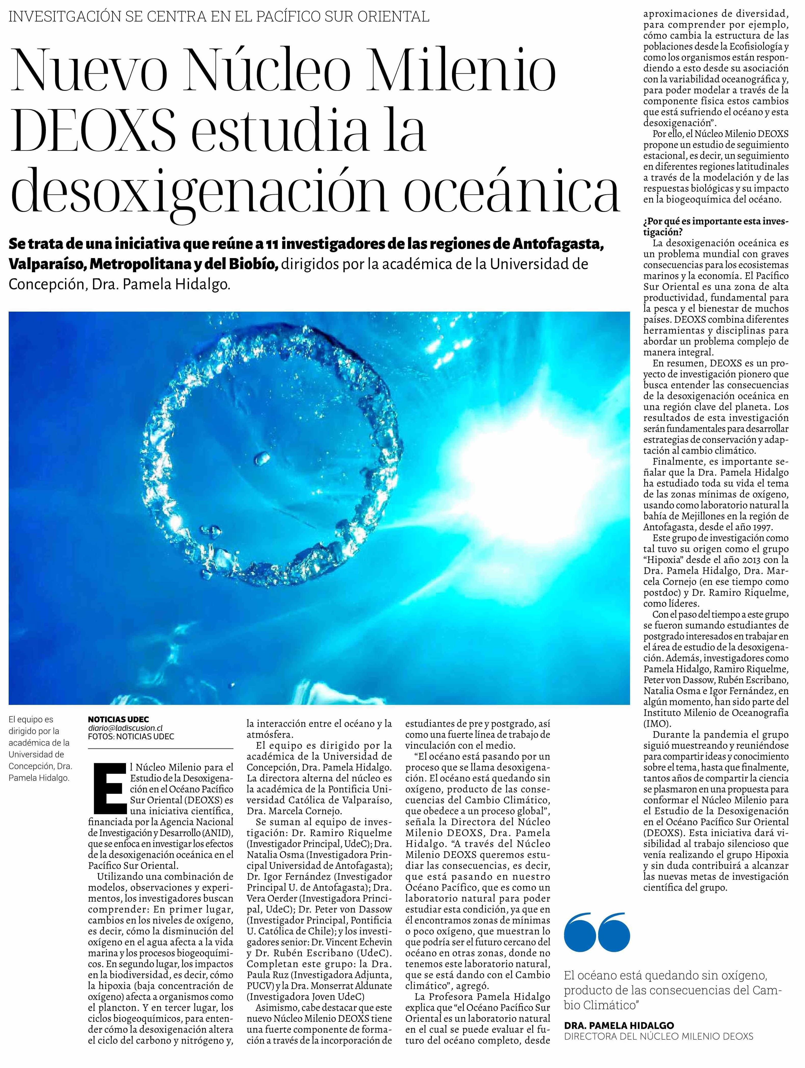 | Título: | Nuevo Núcleo Milenio DEOXS estudia la desoxigenación oceánica |