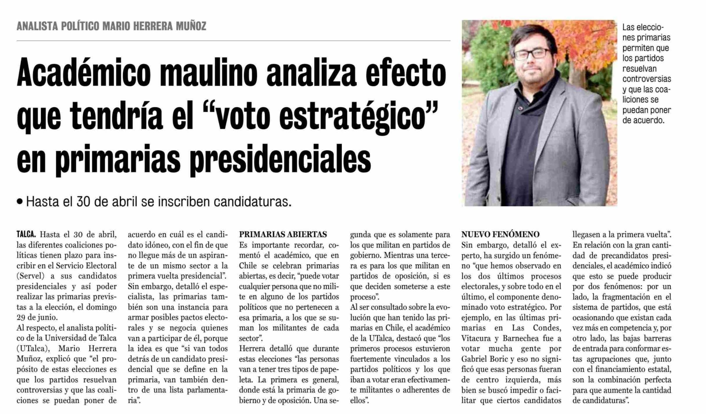 | Título: | Académico maulino analiza efecto que tendría el “voto estratégico” en primarias presidenciales |