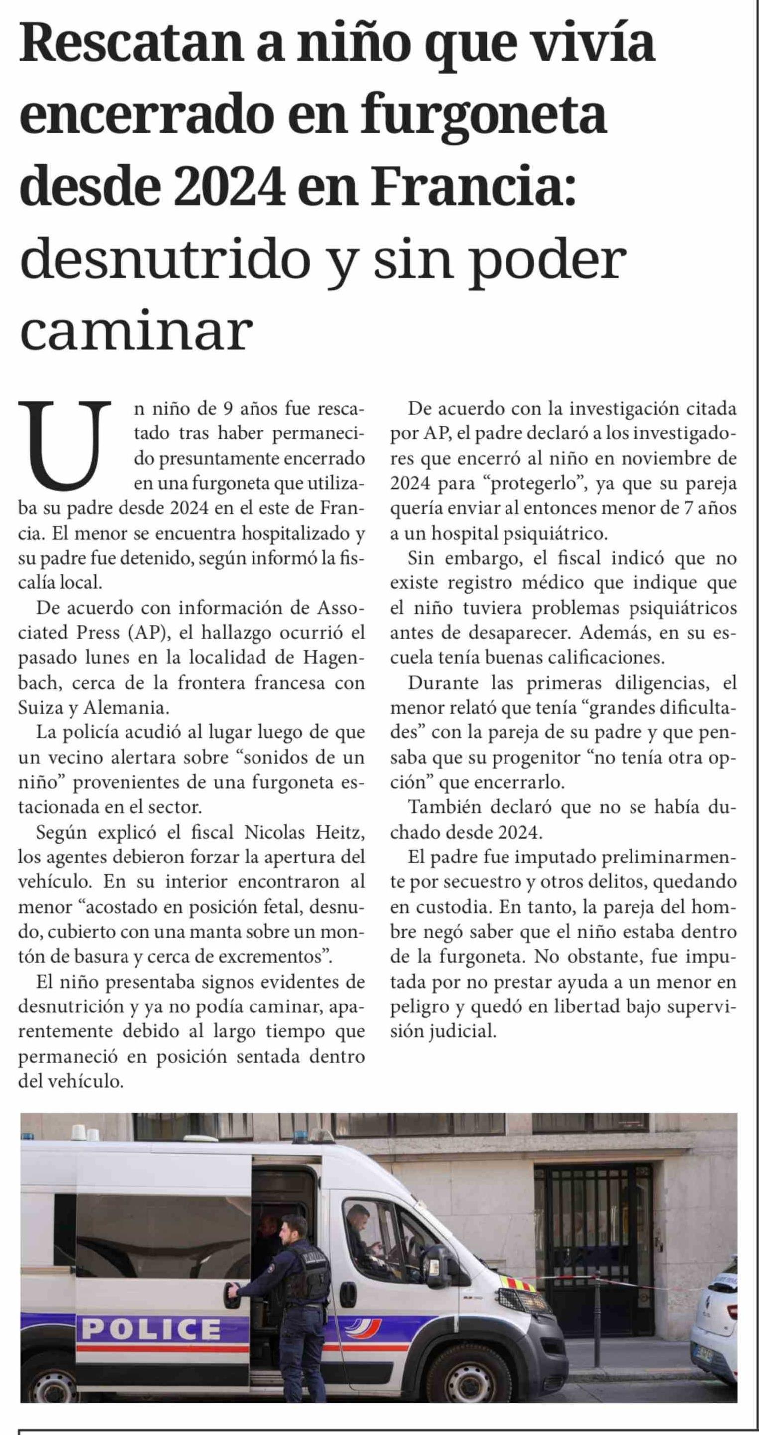 Título: Rescatan a niño que vivía encerrado en furgoneta desde 2024 en Francia: desnutrido y sin poder caminar