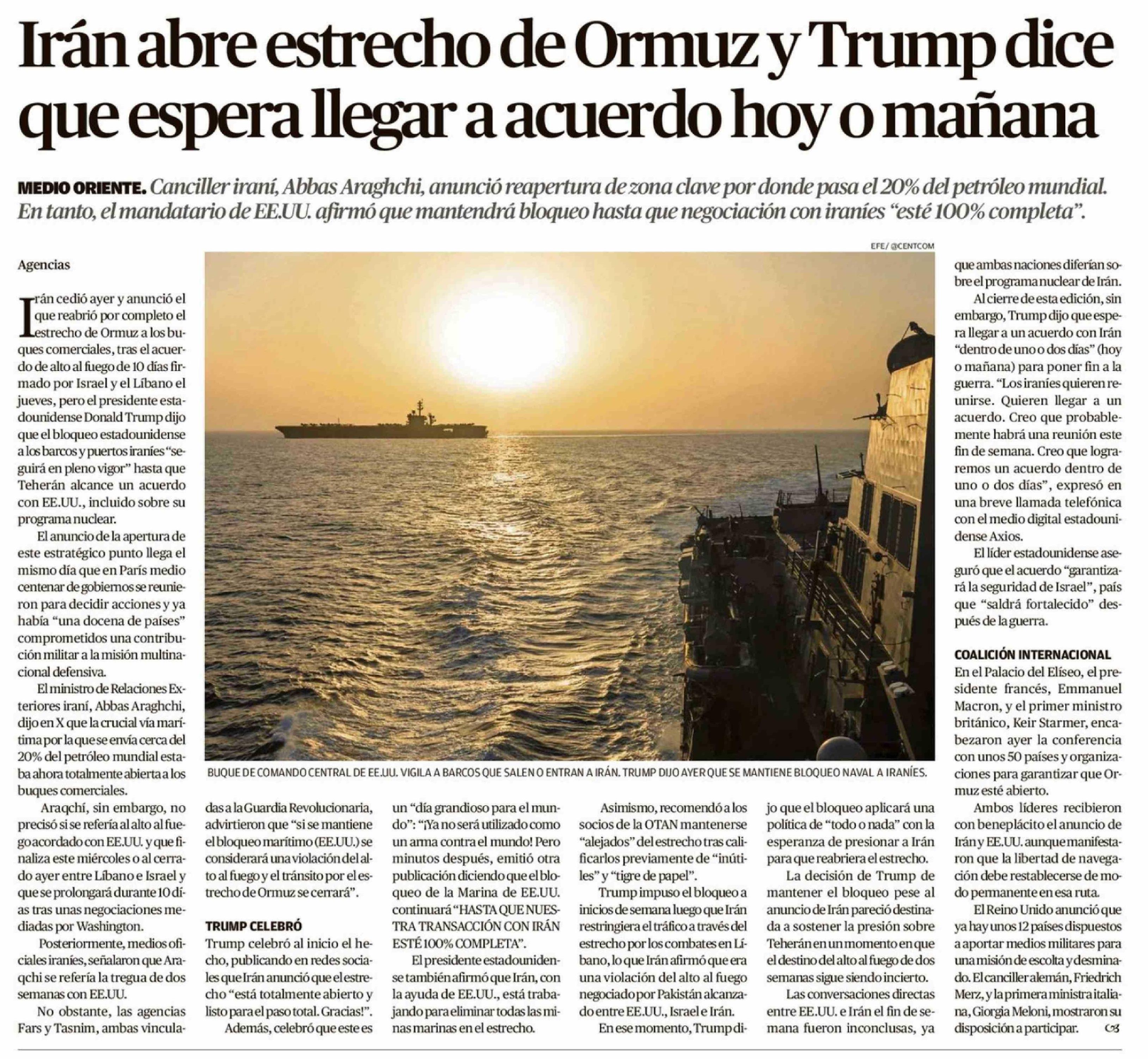 Irán abre estrecho de Ormuz y Trump dice que espera llegar a acuerdo hoy o mañana 18-04-2026 El Austral de Osorno |