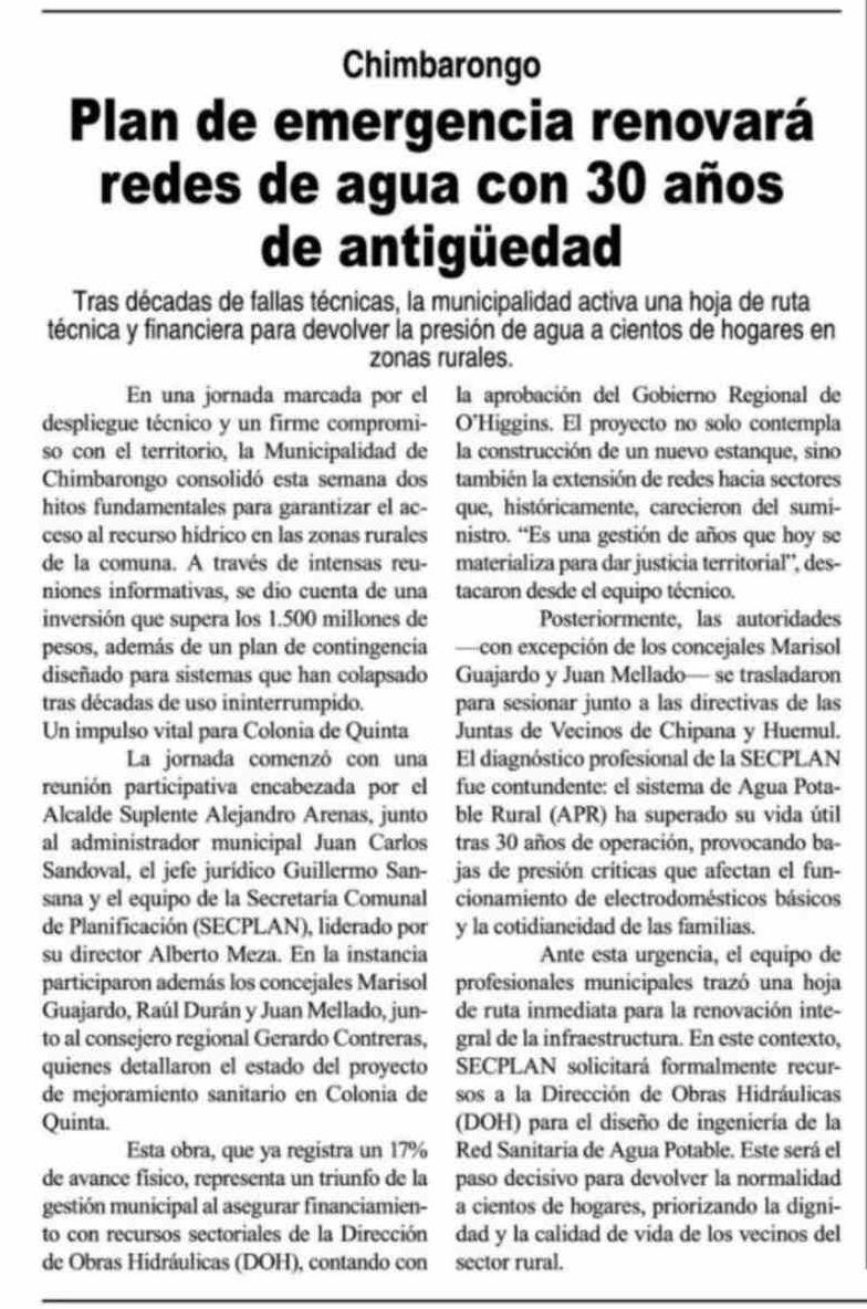 Plan de emergencia renovará redes de agua con 30 años de antigüedad 24-03-2026 Diario VI Región |