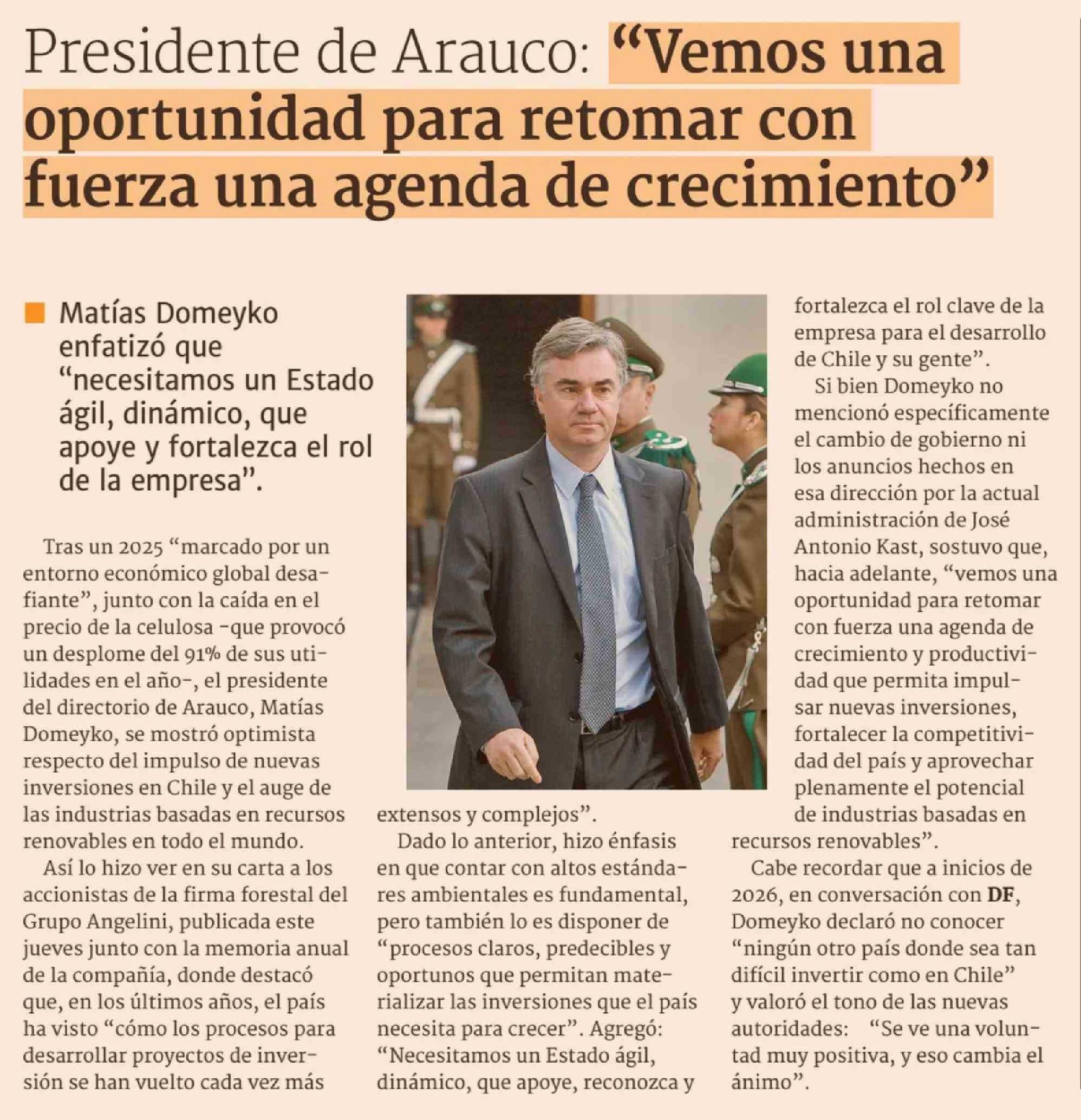 Presidente de Arauco: "Vemos una oportunidad para retomar con fuerza una agenda de crecimiento" 17-04-2026 Diario Financiero |