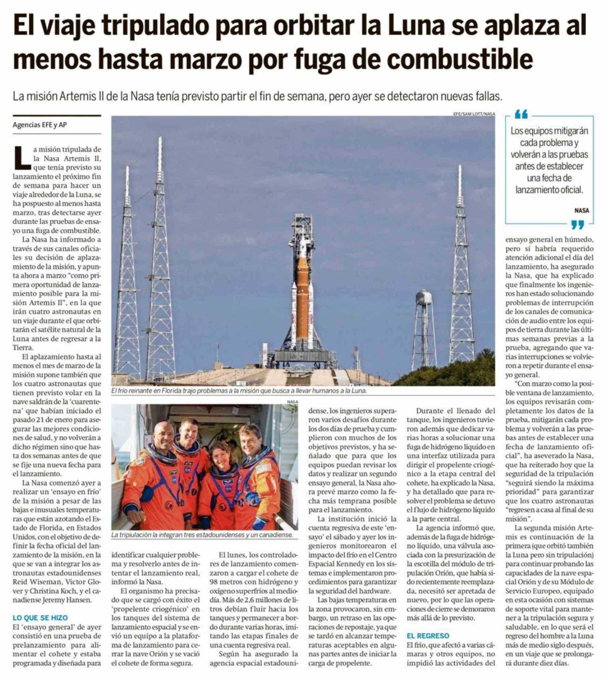 Título: El viaje tripulado para orbitar la Luna se aplaza al menos hasta marzo por fuga de combustible