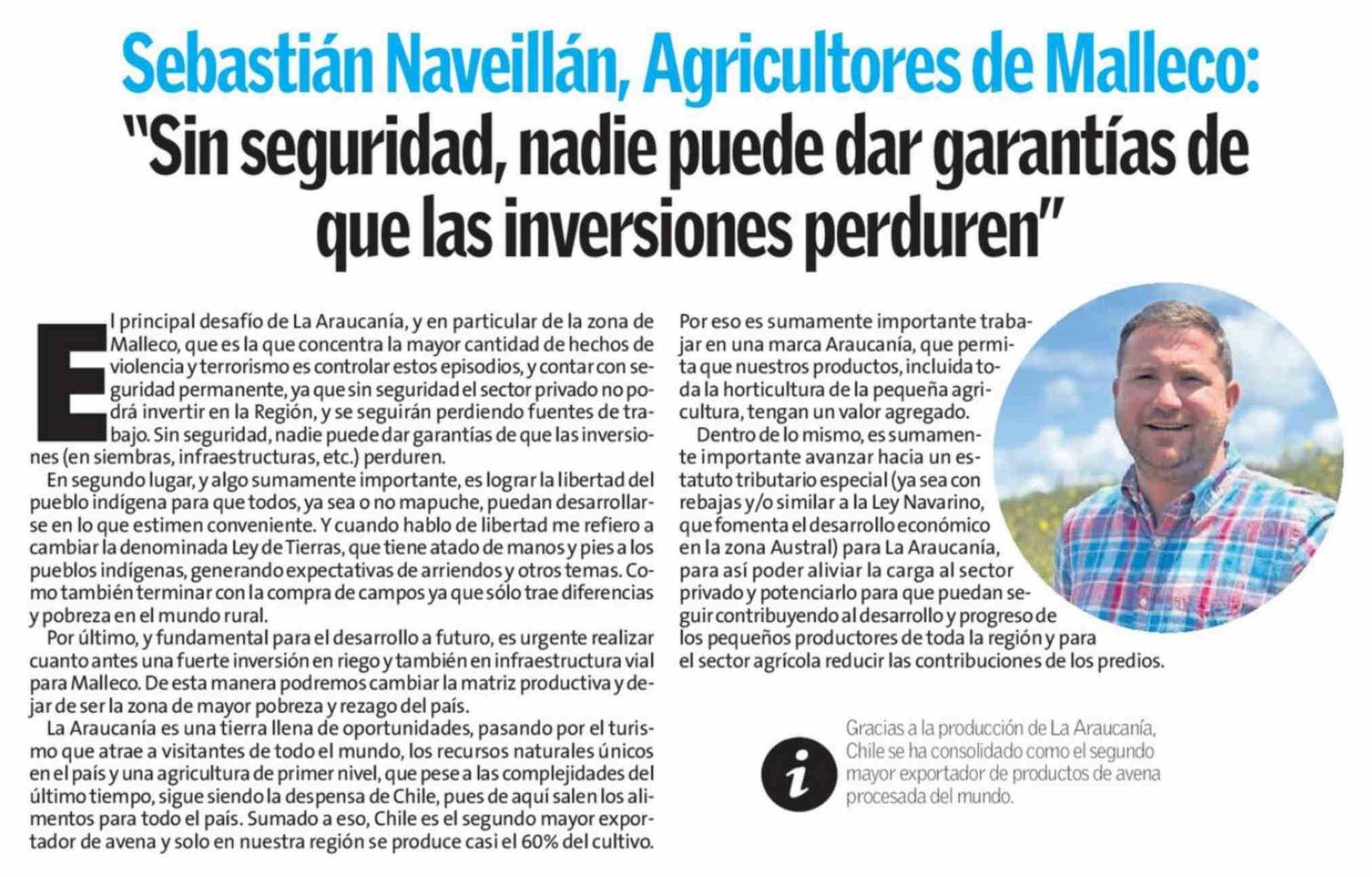 Columnas de Opinión: Sebastián Naveillán, Agricultores de Malleco: "Sin seguridad, nadie puede dar garantías de que las inversiones perduren" 30-03-2026 El Austral de la Araucanía |
