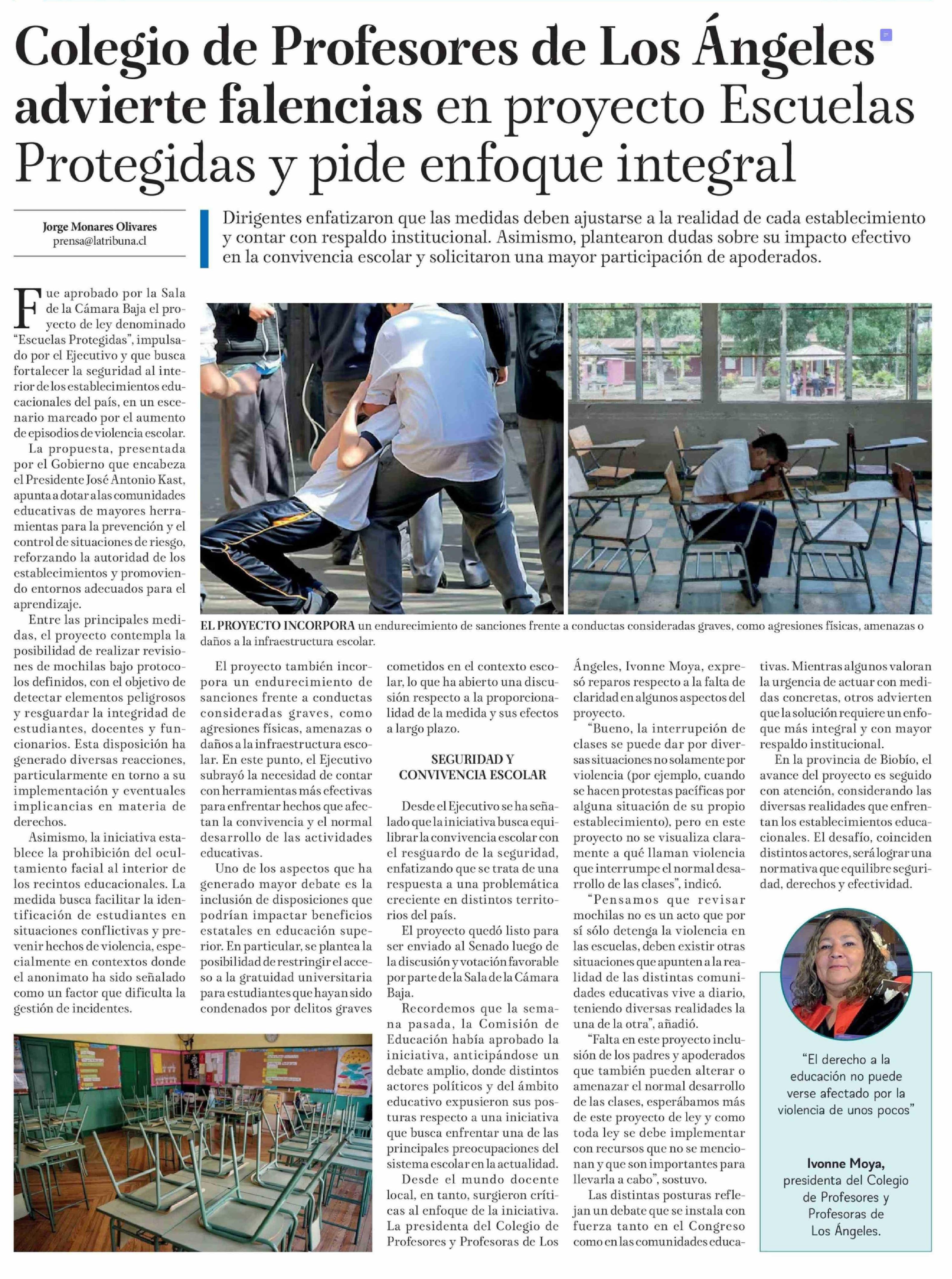 Colegio de Profesores de Los Angeles advierte falencias en proyecto Escuelas Protegidas y pide enfoque integral 22-04-2026 La Tribuna |
