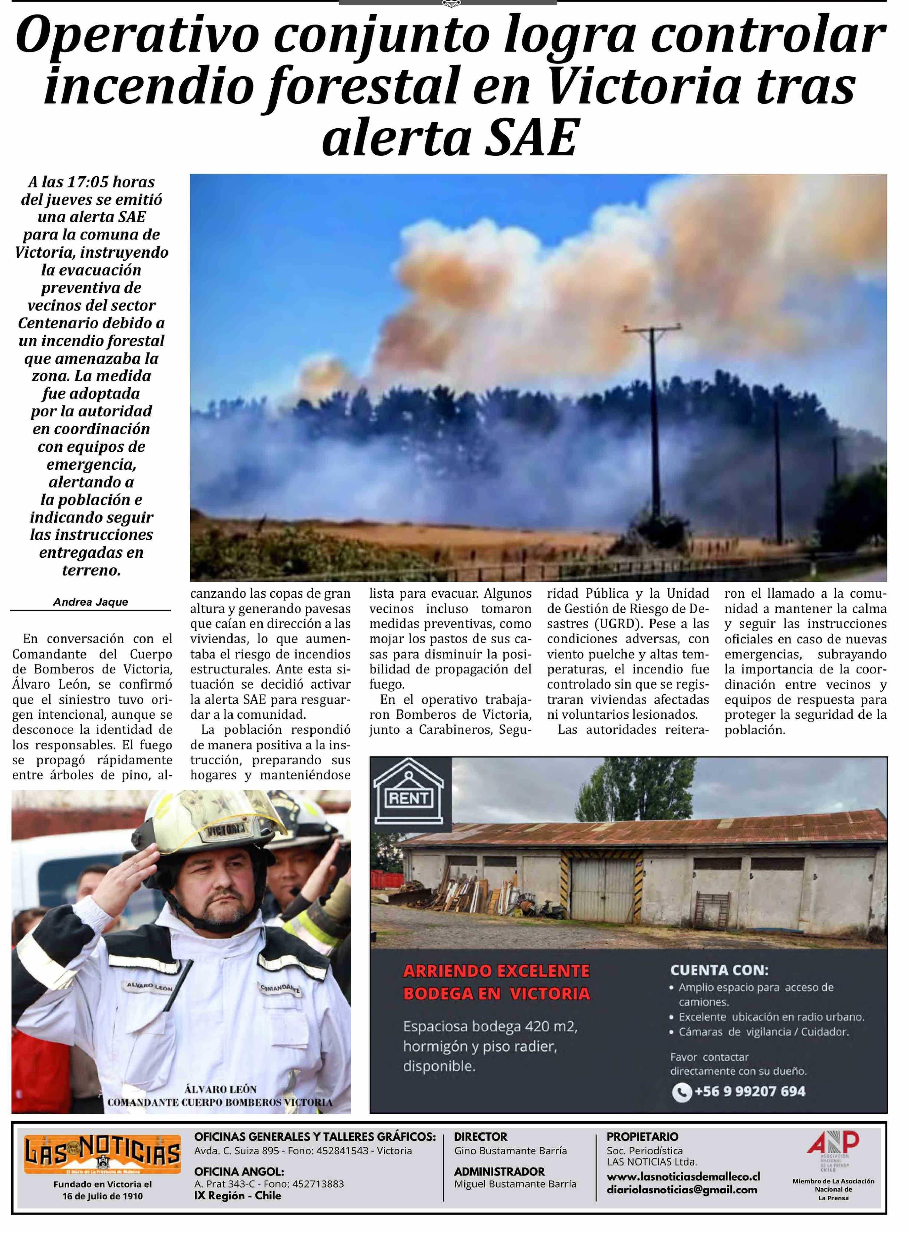 Título: Operativo conjunto logra controlar incendio forestal en Victoria tras alerta SAE
