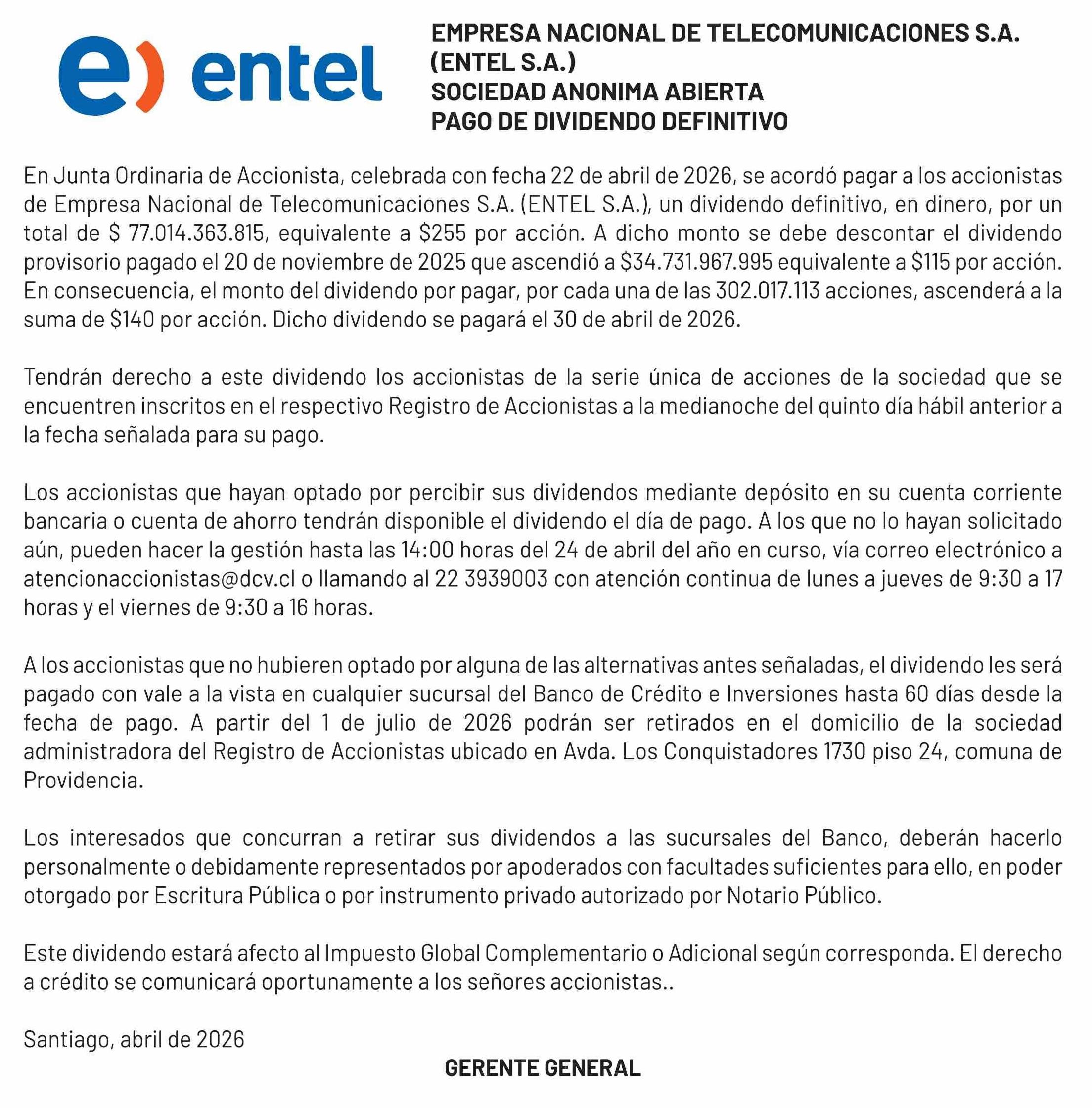 Extractos: EMPRESA NACIONAL DE TELECOMUNICACIONES S.A. 23-04-2026 El Mercurio |