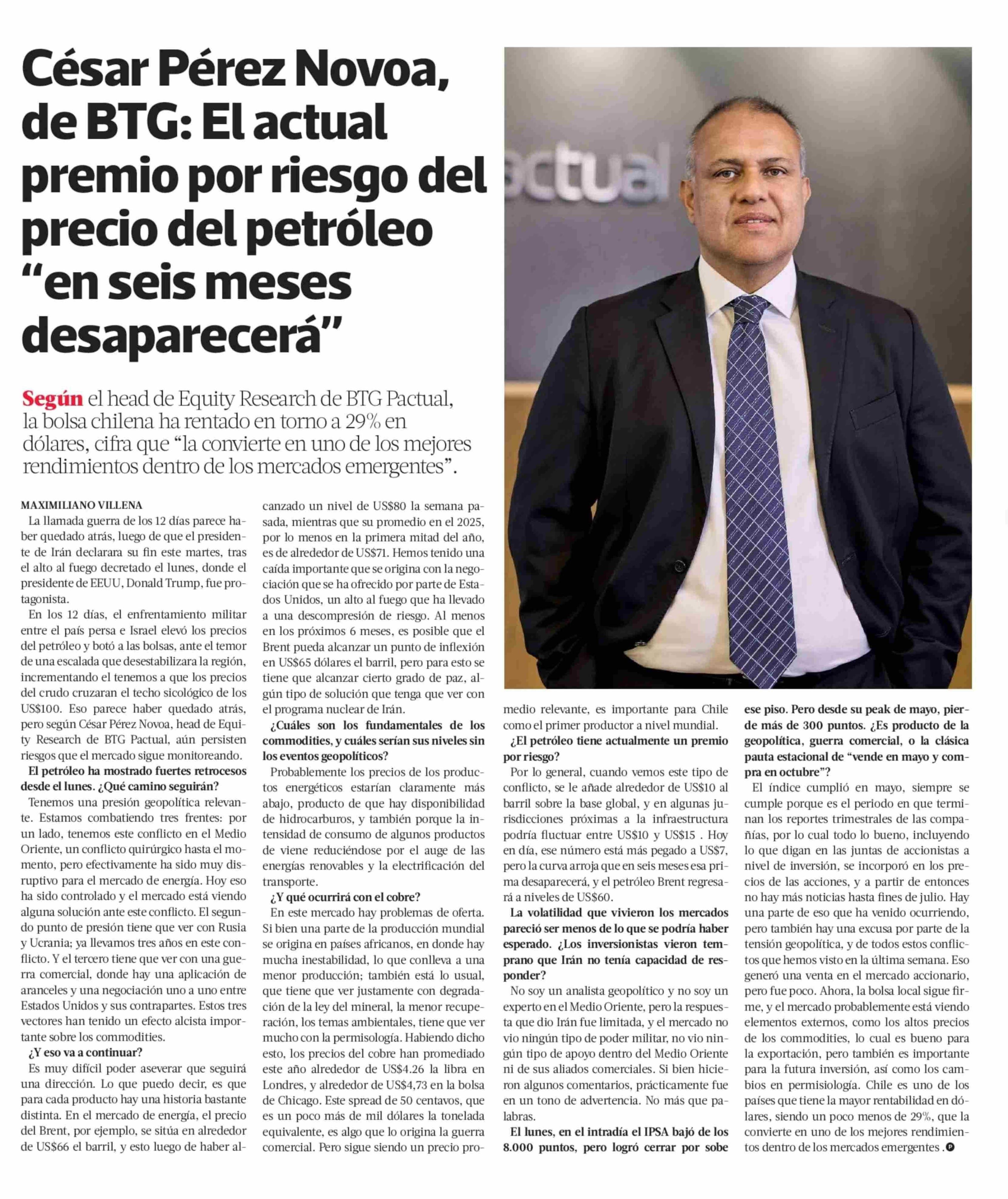 César Pérez Novoa, de BTG: El actual premio por riesgo del precio del petróleo “en seis meses desaparecerá” 25-06-2025 La Tercera |