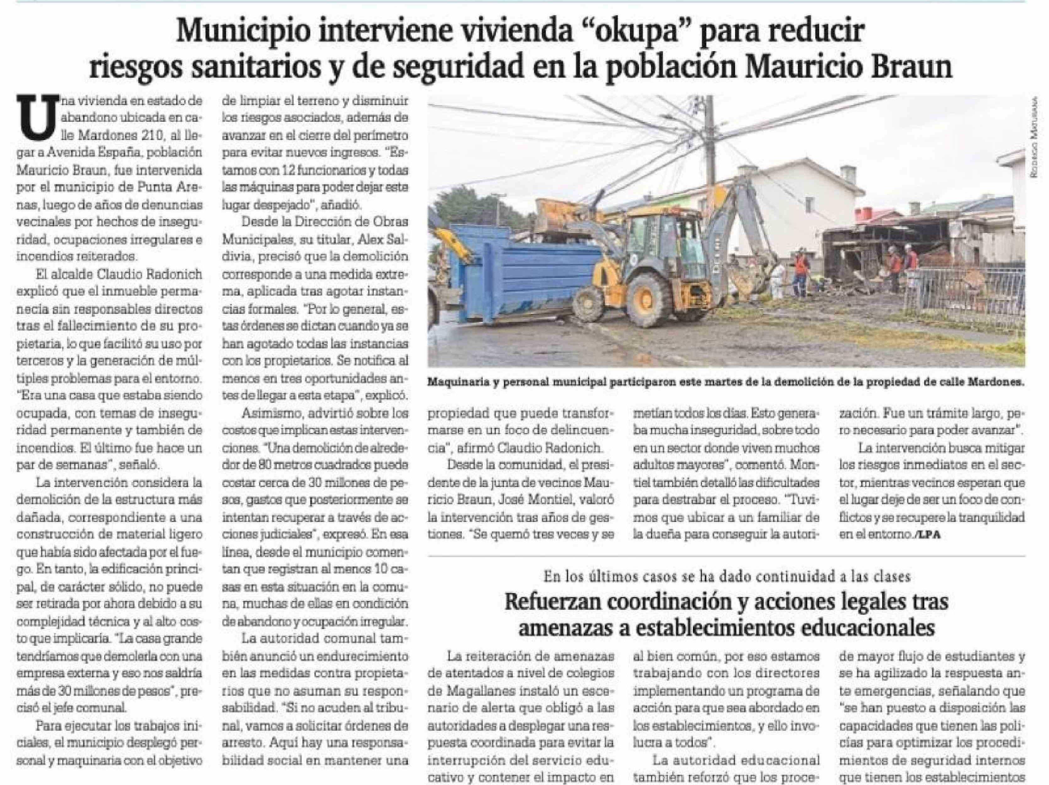 Municipio interviene vivienda "okupa" para reducir riesgos sanitarios y de seguridad en la población Mauricio Braun 15-04-2026 La Prensa Austral |
