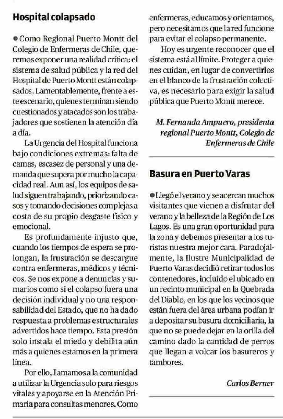 Cartas: Hospital colapsado 11-01-2026 El Llanquihue |