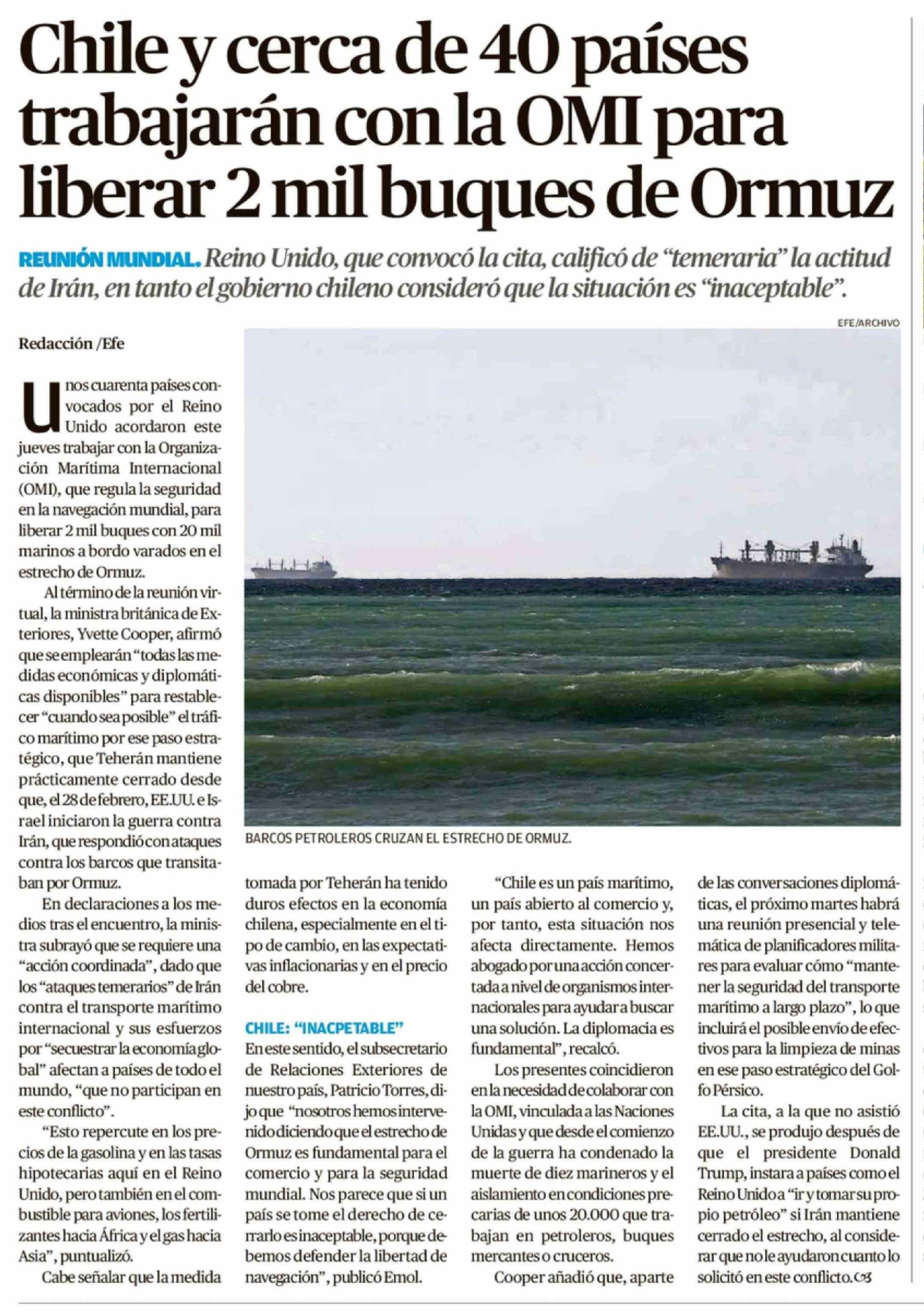 | Título: | Chile y cerca de 40 países trabajarán con la OMI para liberar 2 mil buques de Ormuz |