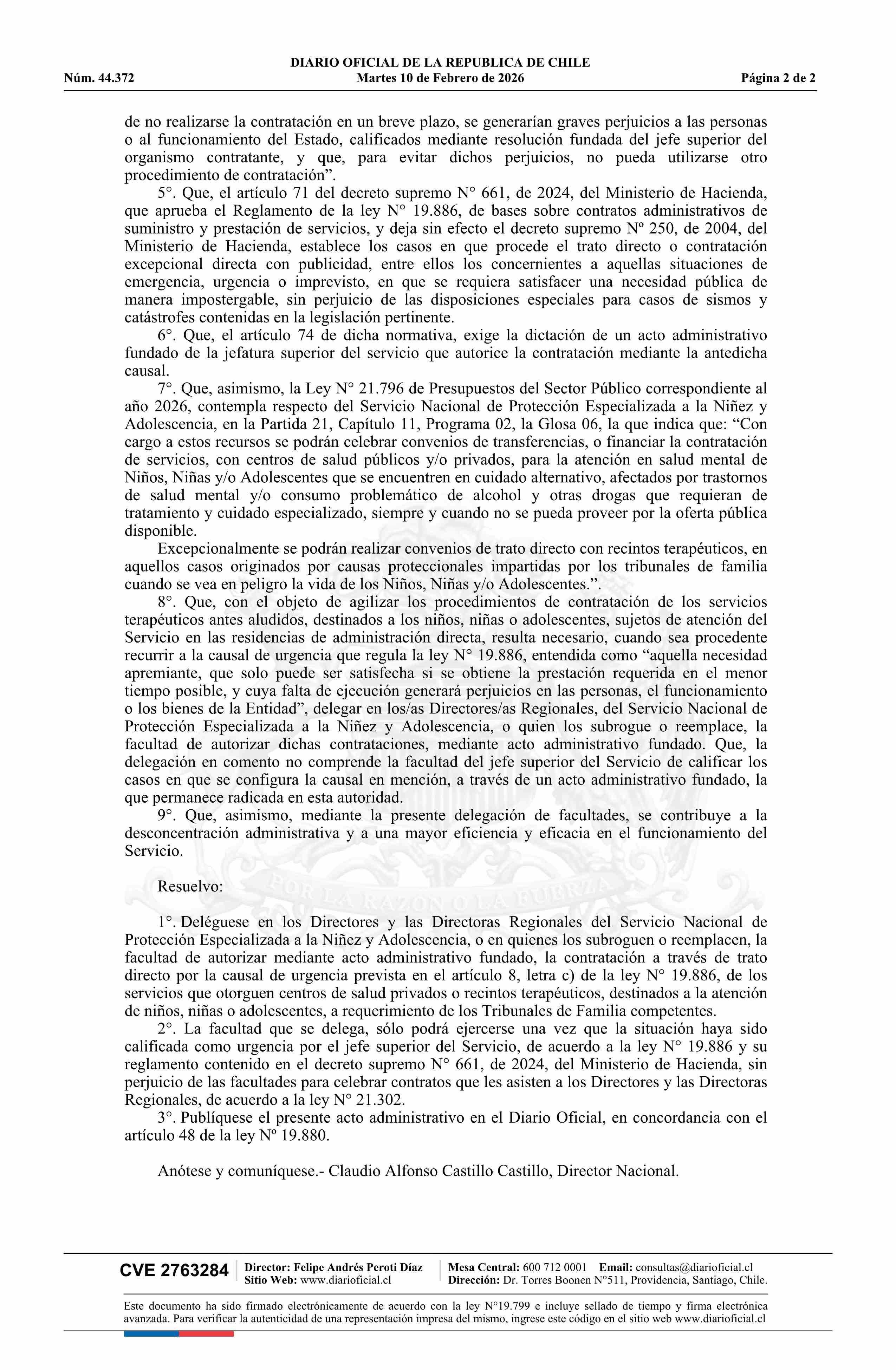 Título: Resolución exenta número 75, de 2026.- Delega facultad que indica en los/as directores/as regionales del Servicio Nacional de Protección Especializada a la Niñez y Adolescencia