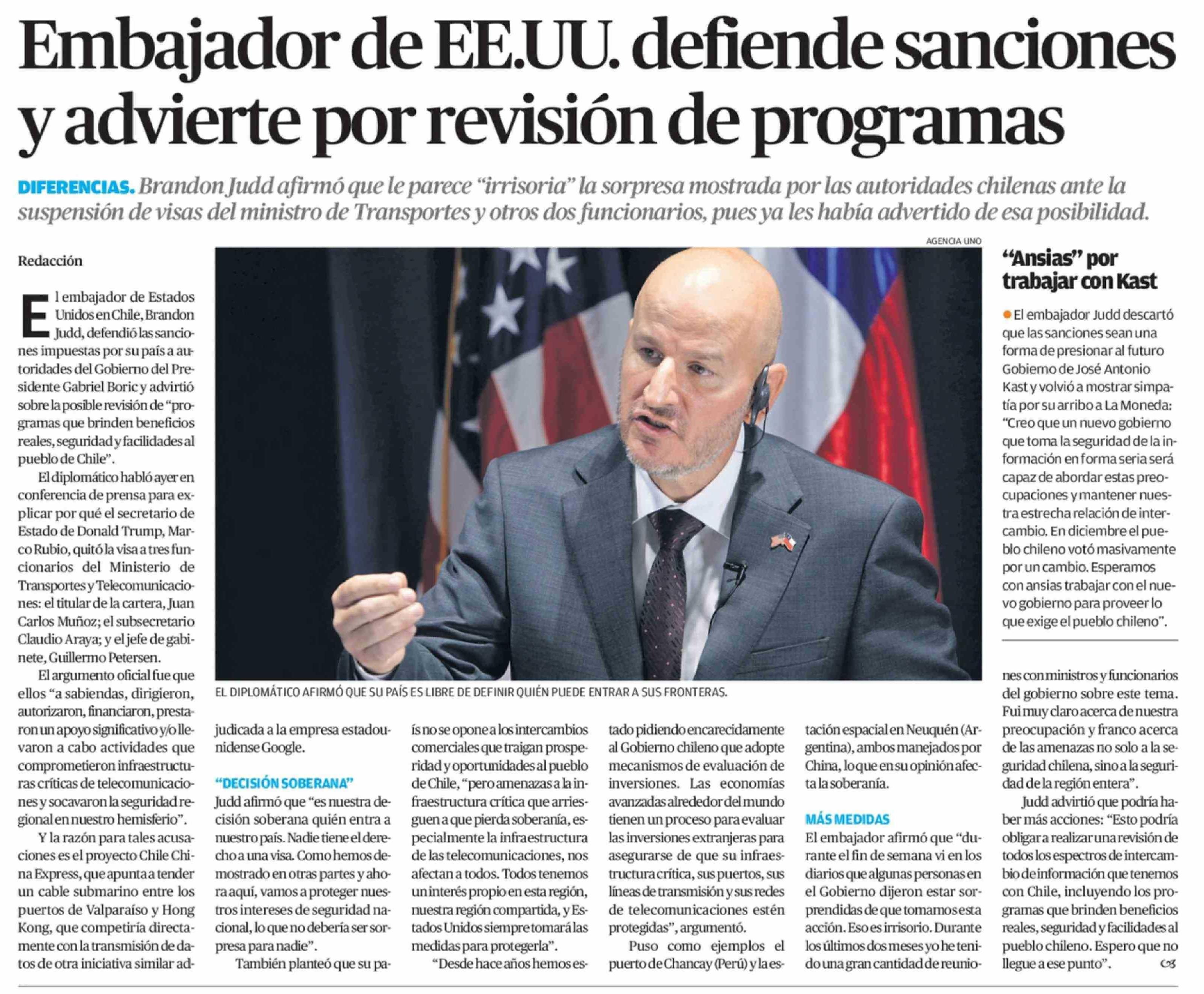 Título: Embajador de EE.UU. defiende sanciones y advierte por revisión de programas