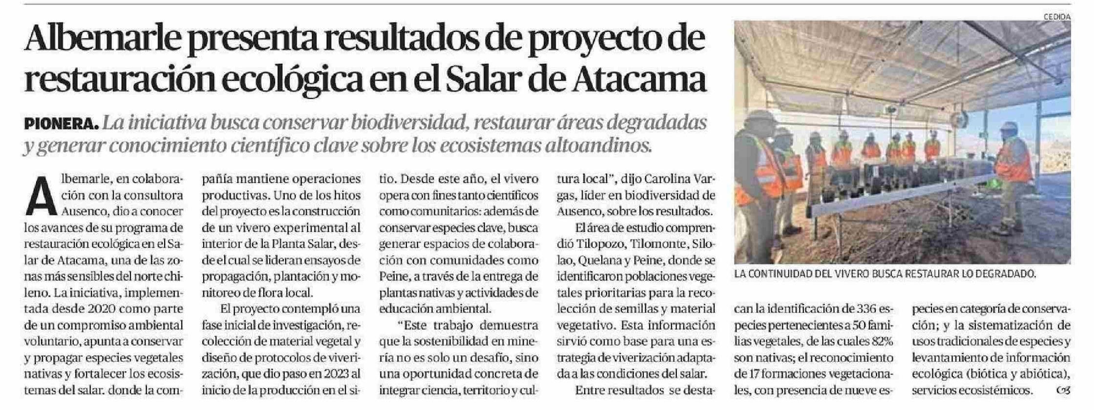 Título: Albemarle presenta resultados de proyecto de restauración ecológica en el Salar de Atacama