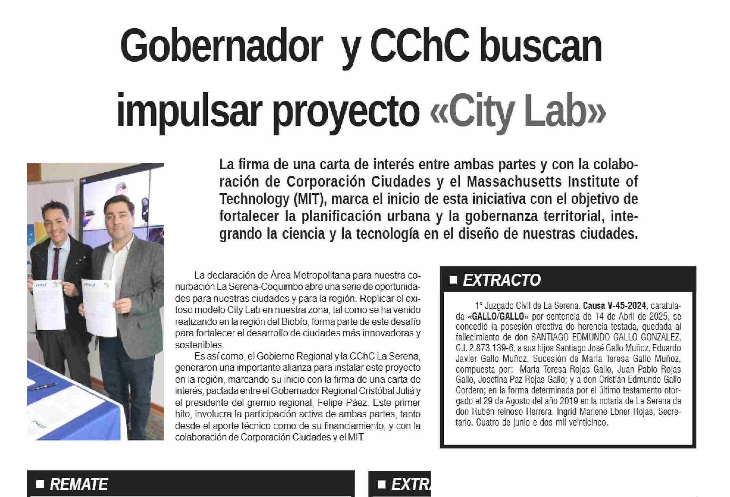 | Título: | Gobernador y CChC buscan impulsar proyecto «City Lab» |
