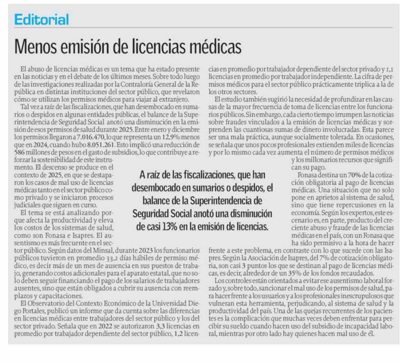 EDITORIAL: Menos emisión de licencias médicas 26-02-2026 El Sur |
