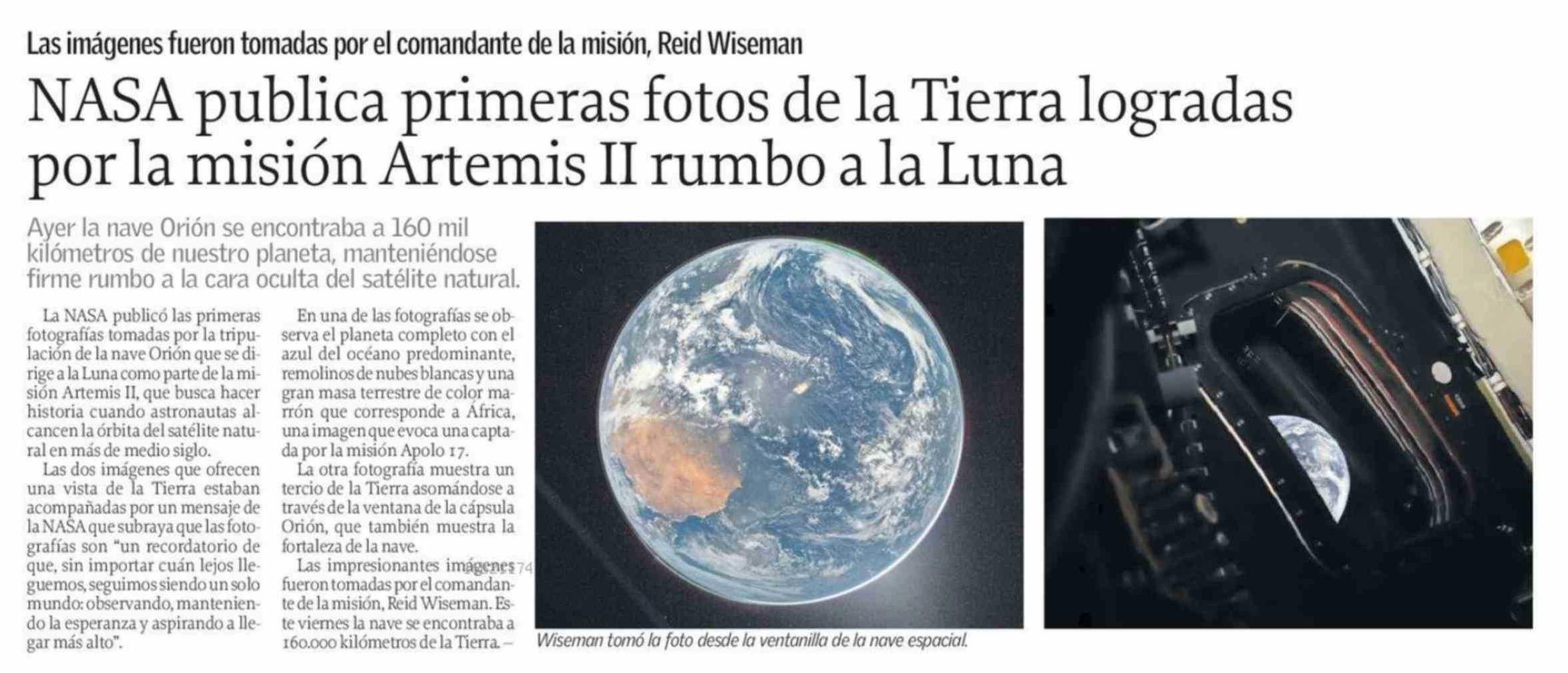 | Título: | NASA publica primeras fotos de la Tierra logradas por la misión Artemis II rumbo a la Luna |