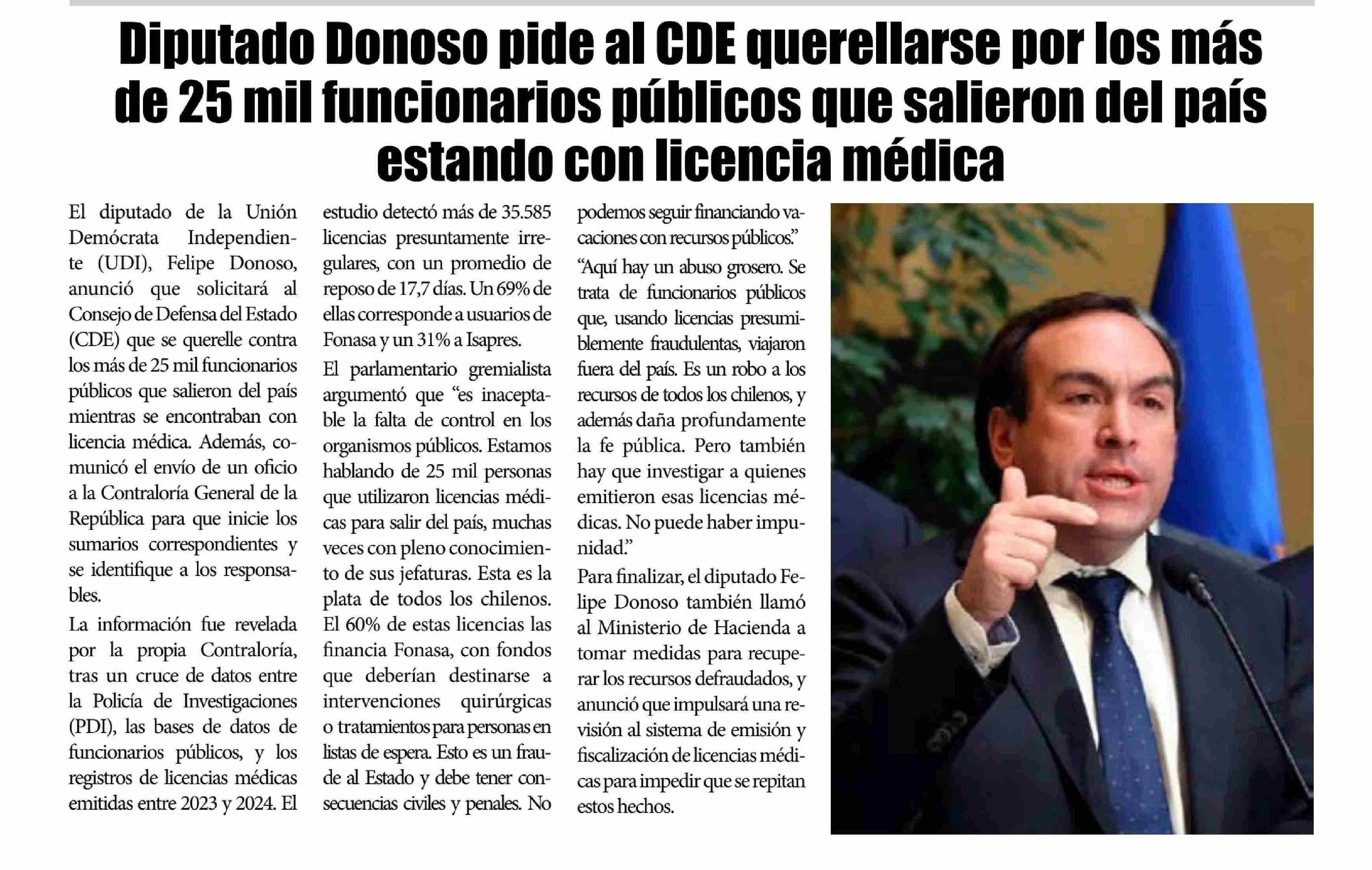 Diputado Donoso pide al CDE querellarse por los más de 23 mil funcionarios públicos que salieron del país estando con licencia médica 22-05-2025 El Lector |