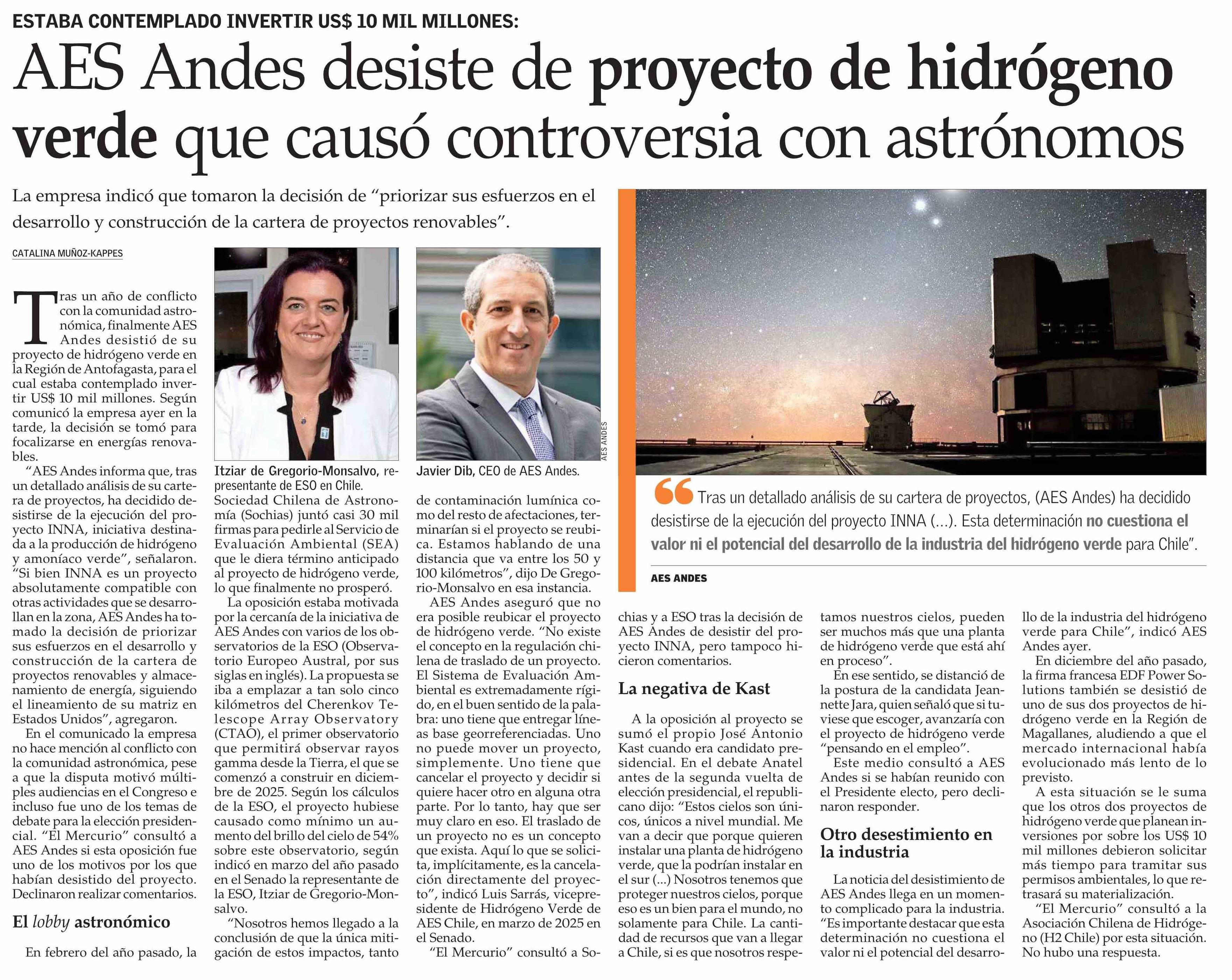 AES Andes desiste de proyecto de hidrógeno verde que causó controversia con astrónomos 24-01-2026 El Mercurio |
