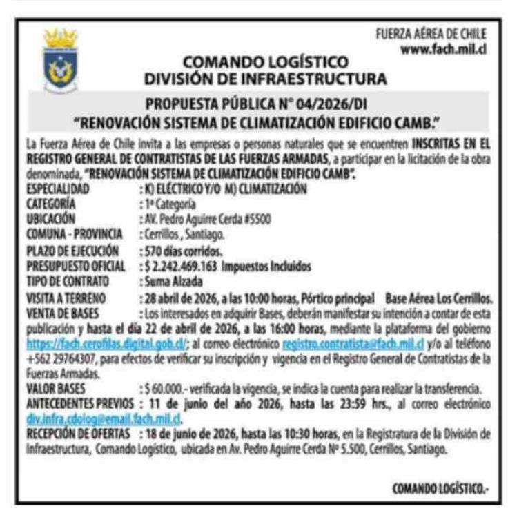 | Título: | Extractos: FUERZA AÉREA DE CHILE www.fach.mil.c COMANDO LOGÍSTICO DIVISIÓN DE INFRAESTRUCTURA PROPUESTA PÚBLICA Nº 04/2026/DI "RENOVACIÓN SISTEMA DE CLIMATIZACIÓN EDIFICIO CAMB." La Fuerza Aérea de Chile invita a las empresas o personas naturales que se encuentren INSCRITAS EN EL REGISTRO GENERAL DE |