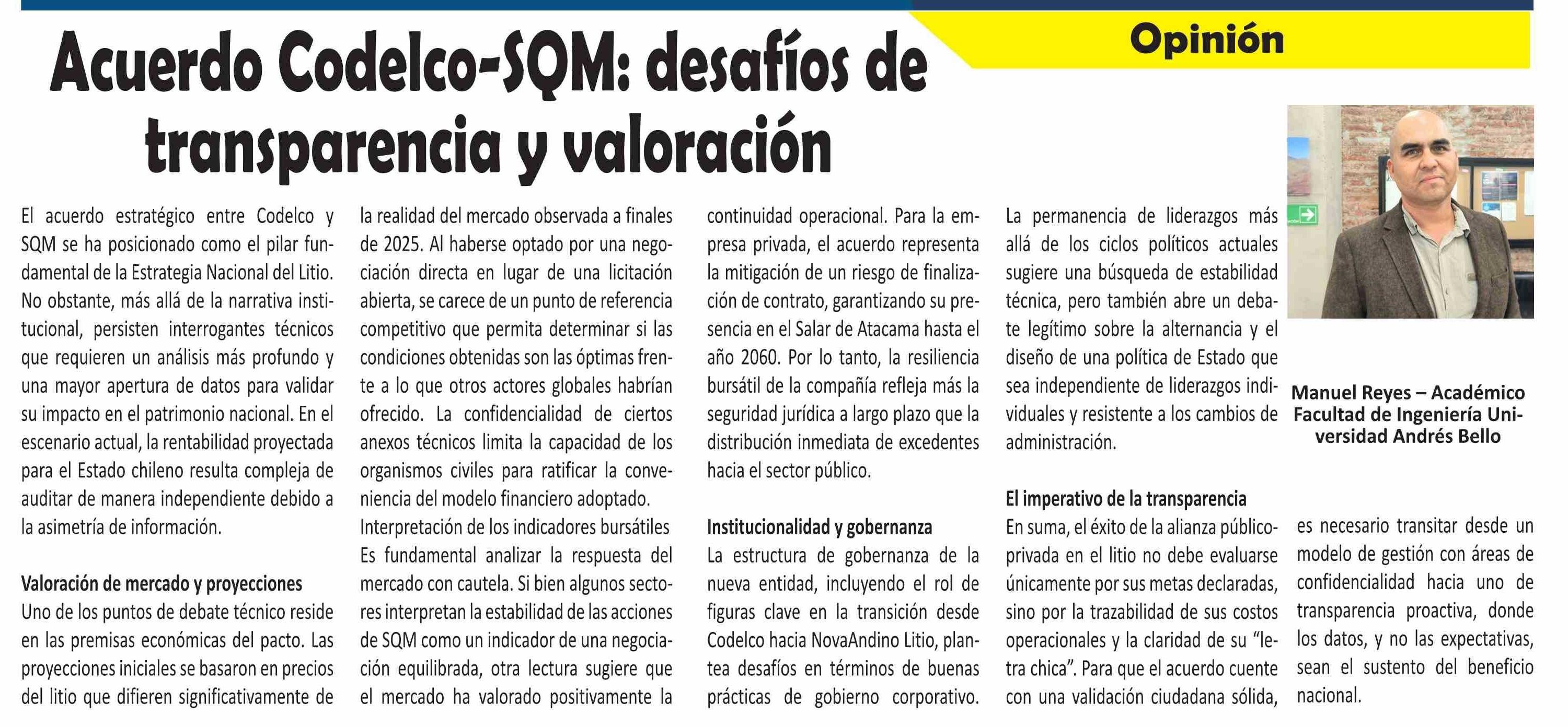 Título: Columnas de Opinión: Acuerdo Codelco-SQM: desafíos de transparencia y valoración