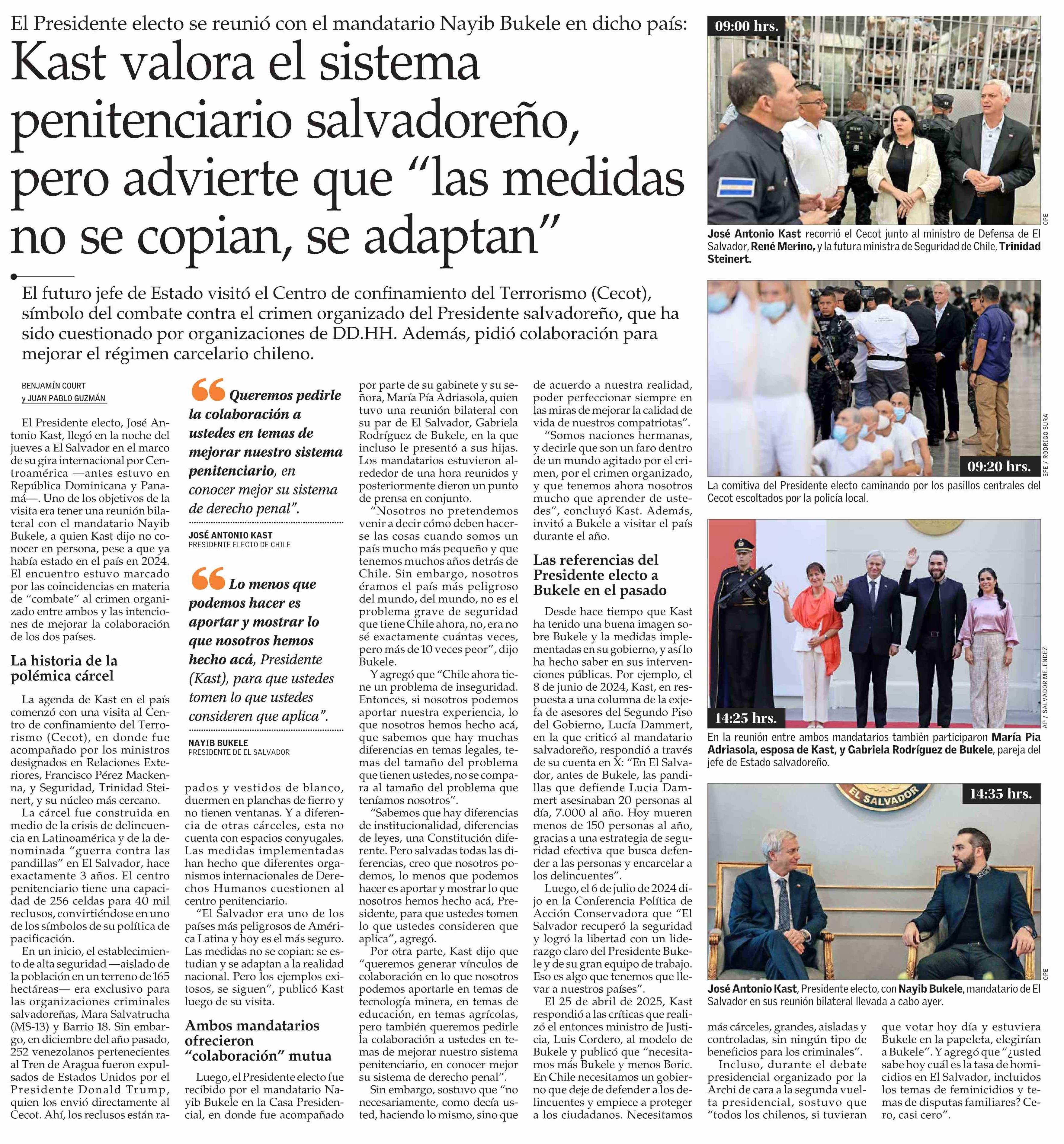 Kast valora el sistema penitenciario salvadoreño, pero advierte que “las medidas no se copian, se adaptan” 31-01-2026 El Mercurio |