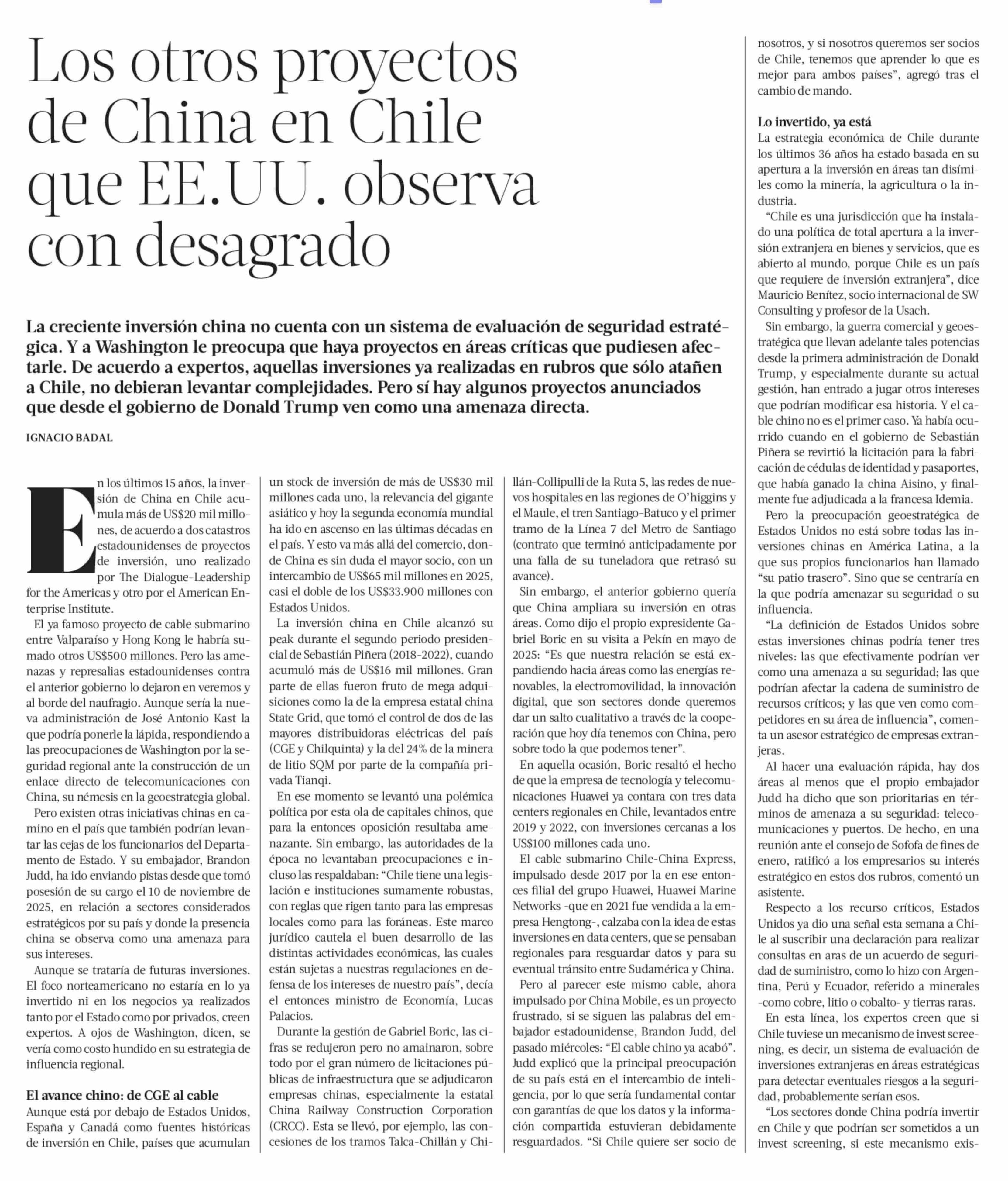 Los otros proyectos de China en Chile que EE.UU. observa con desagrado 15-03-2026 La Tercera |