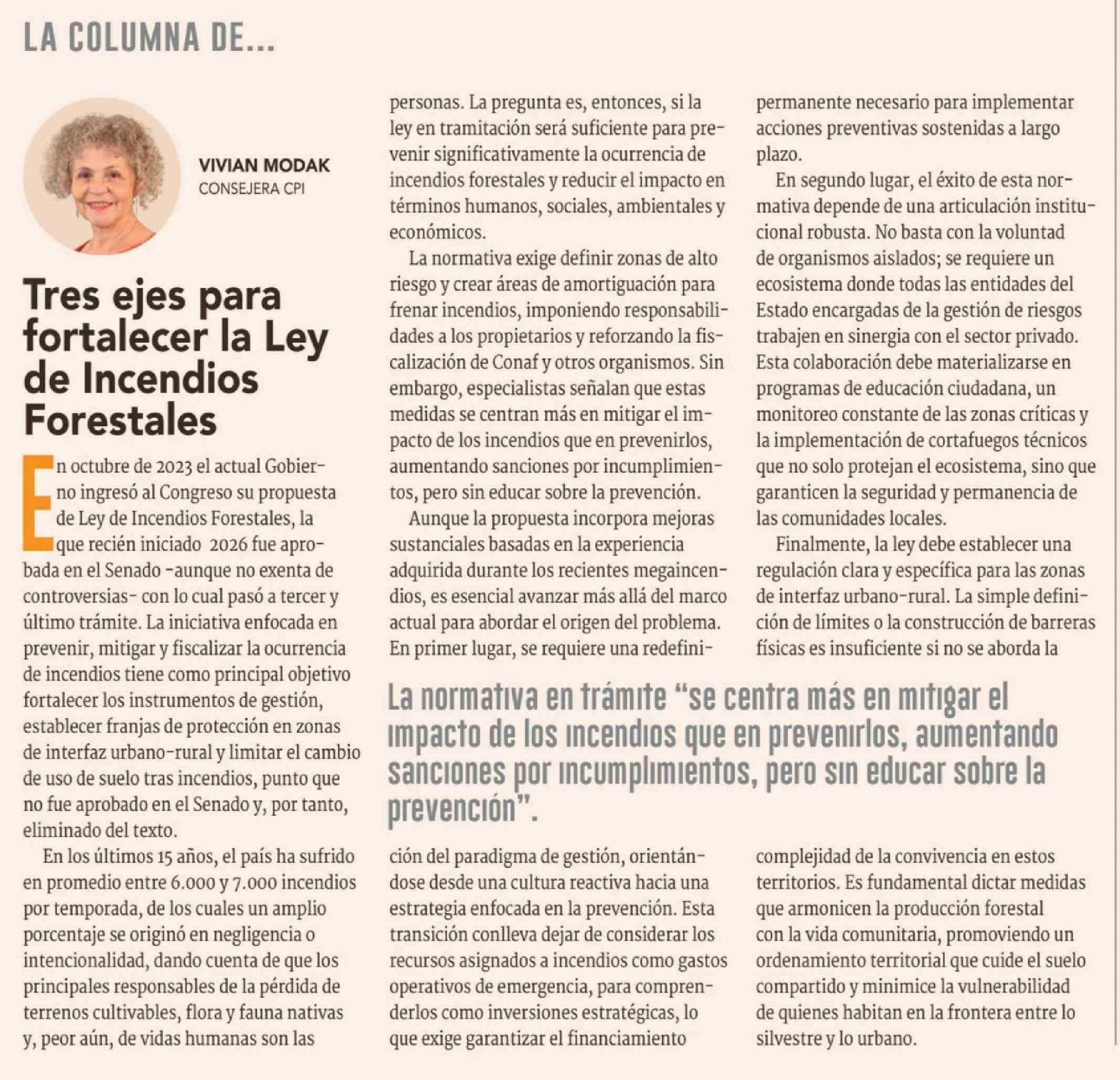 Columnas de Opinión: Tres ejes para fortalecer la Ley de Incendios Forestales 09-02-2026 Diario Financiero |