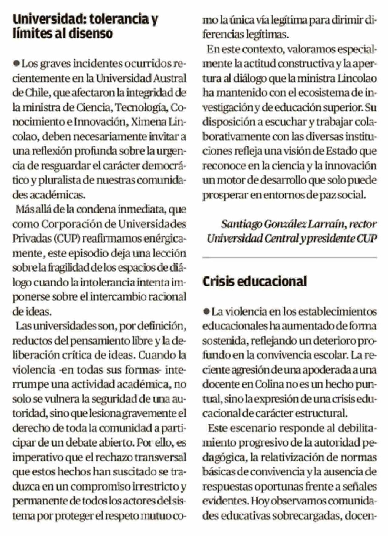 Cartas: Universidad: tolerancia y límites al disenso 22-04-2026 Crónica de Chillán |