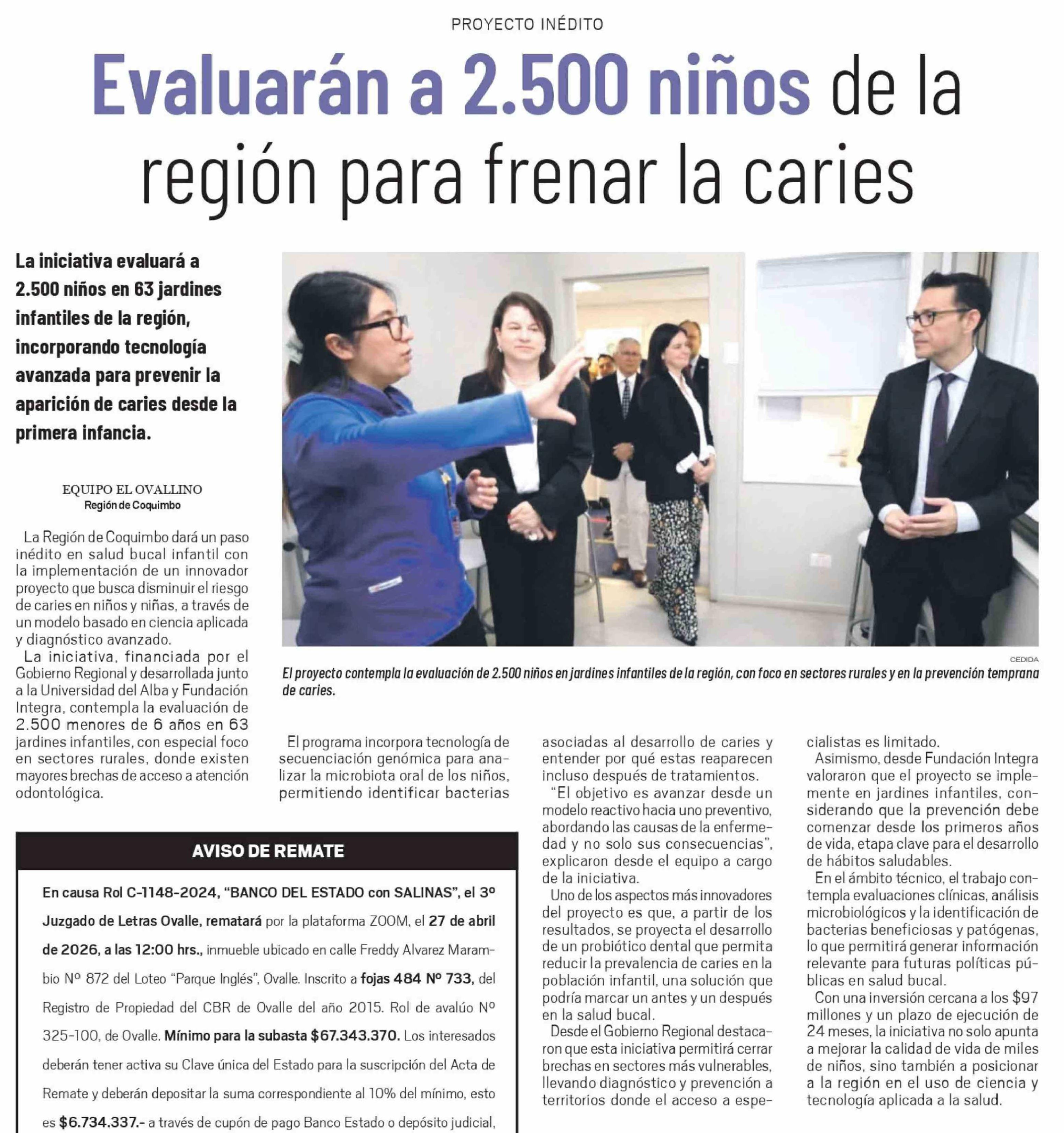 Título: Evaluarán a 2.500 niños de la región para frenar la caries