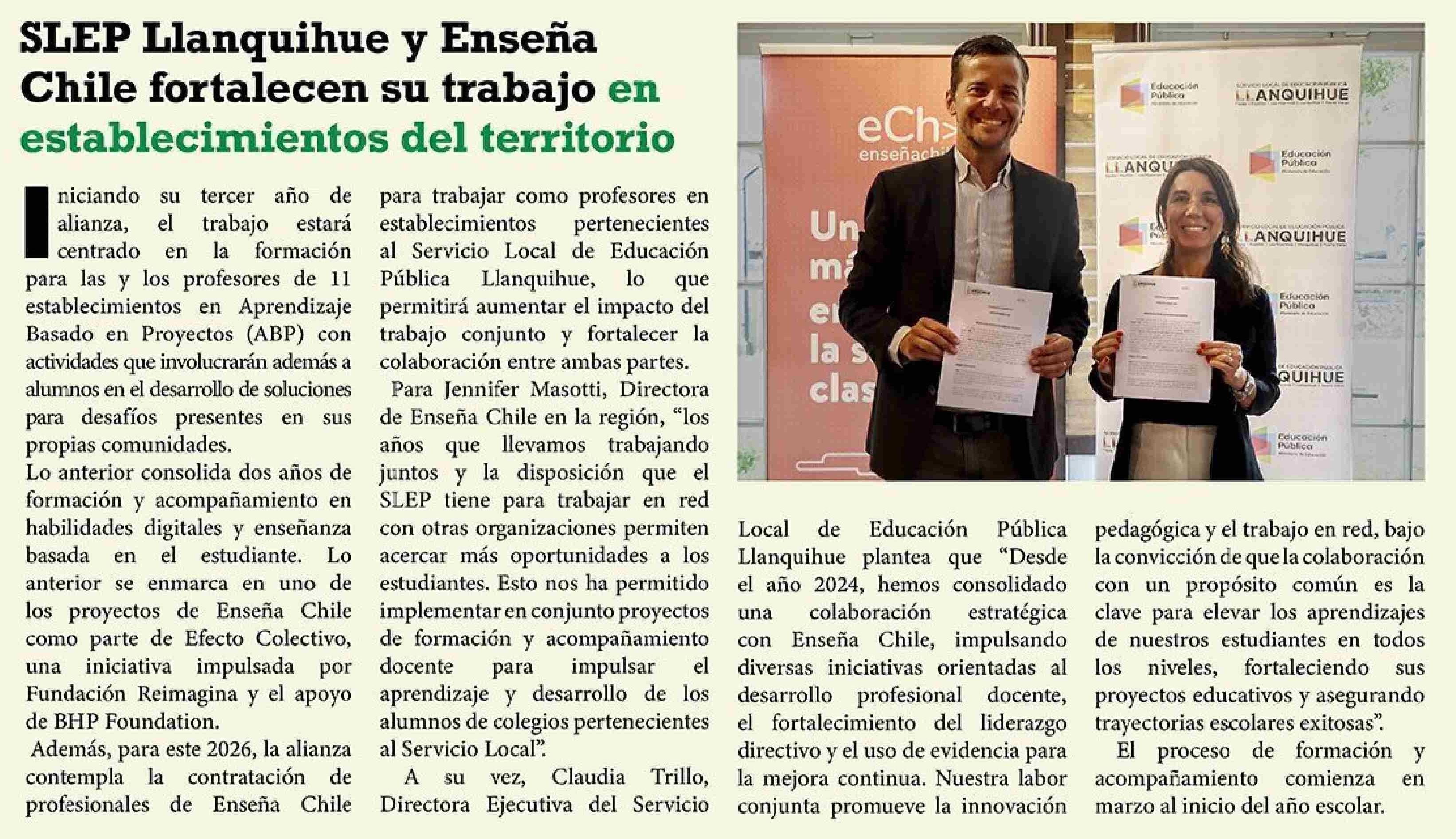 SLEP Llanquihue y Enseña Chile fortalecen su trabajo en establecimientos del territorio 14-01-2026 El Heraldo Austral |