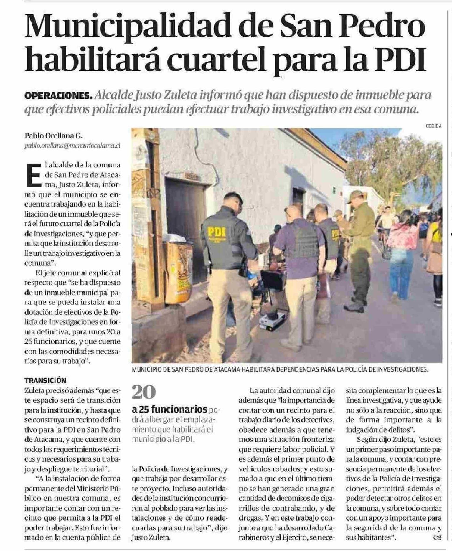 Municipalidad de San Pedro habilitará cuartel para la PDI 03-06-2025 El Mercurio de Calama |