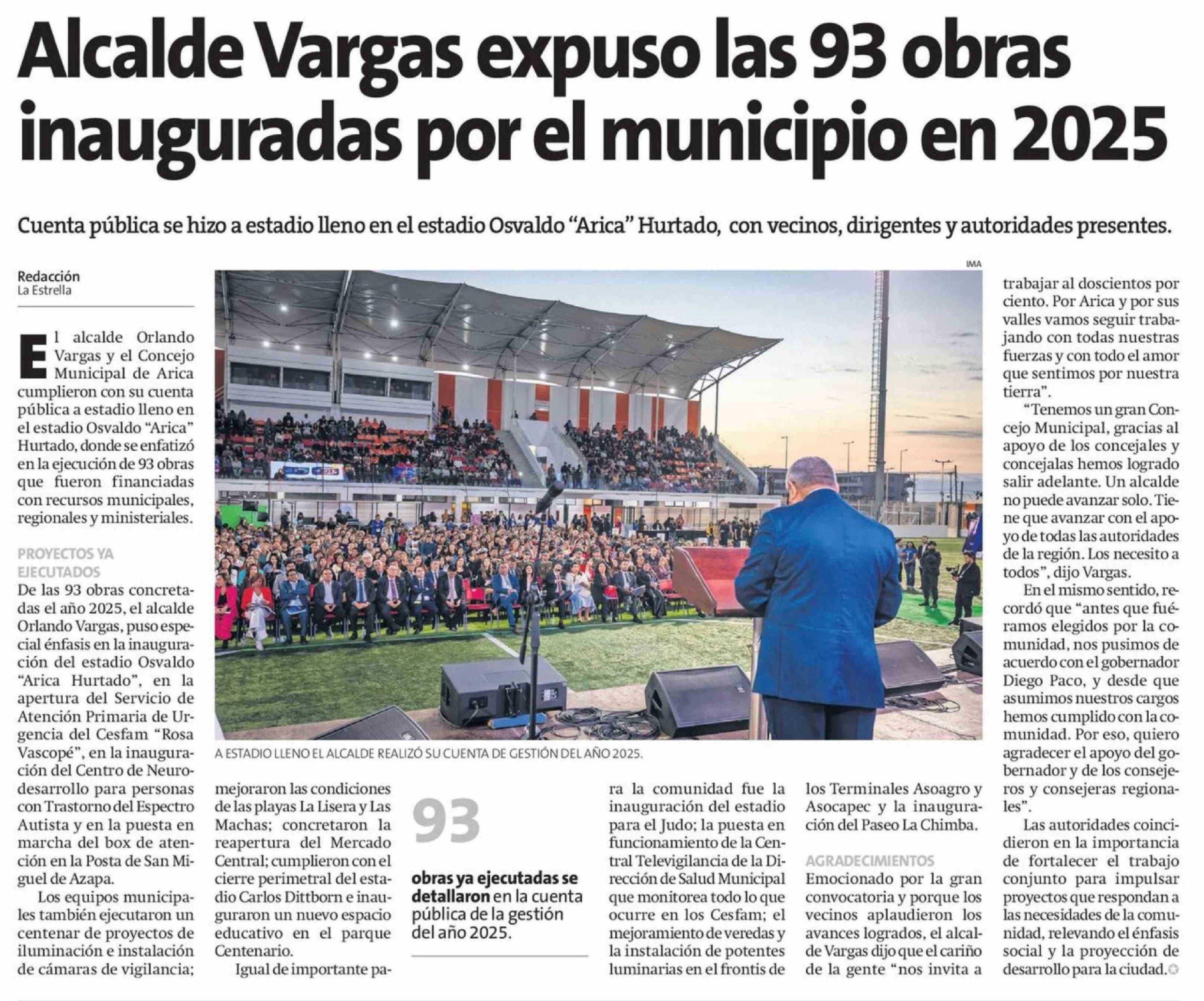 Alcalde Vargas expuso las 93 obras inauguradas por el municipio en 2025 28-04-2026 La Estrella de Arica |