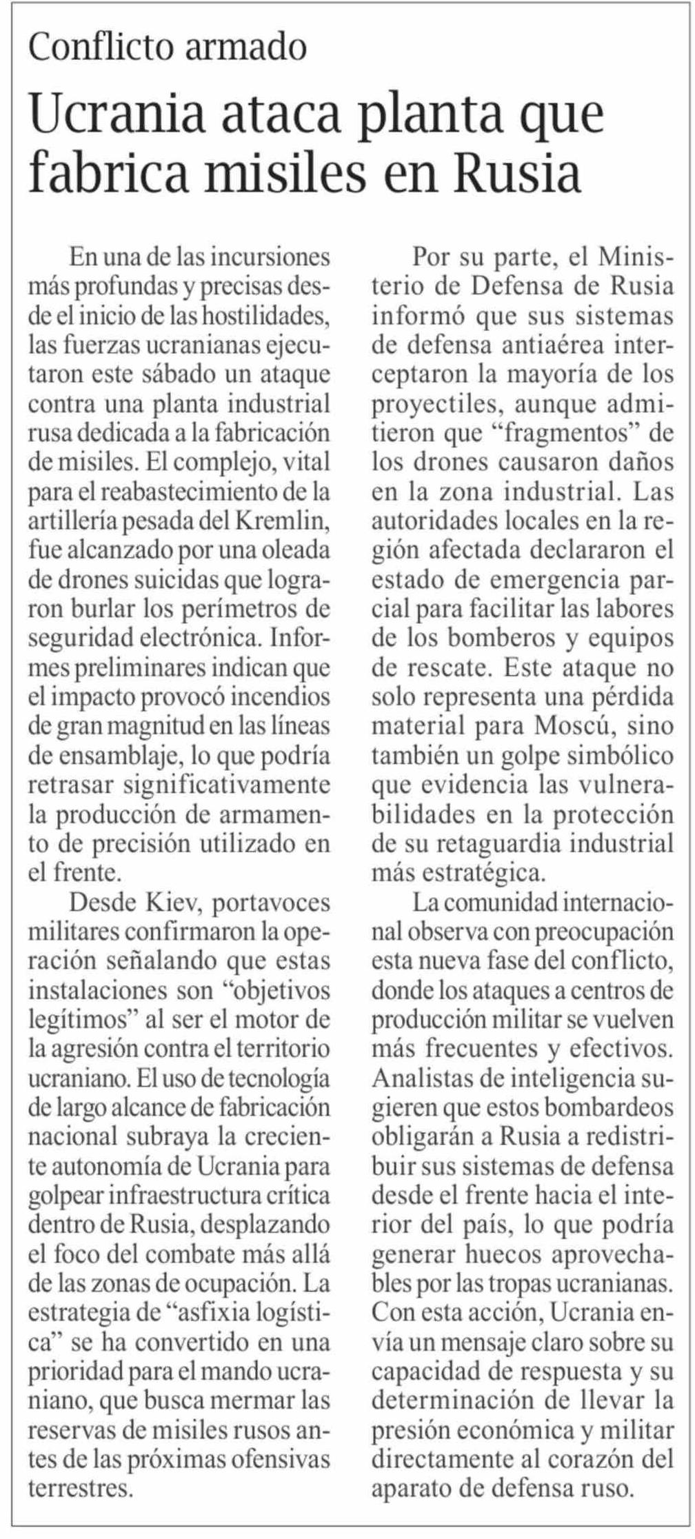 | Título: | Ucrania ataca planta que fabrica misiles en Rusia |