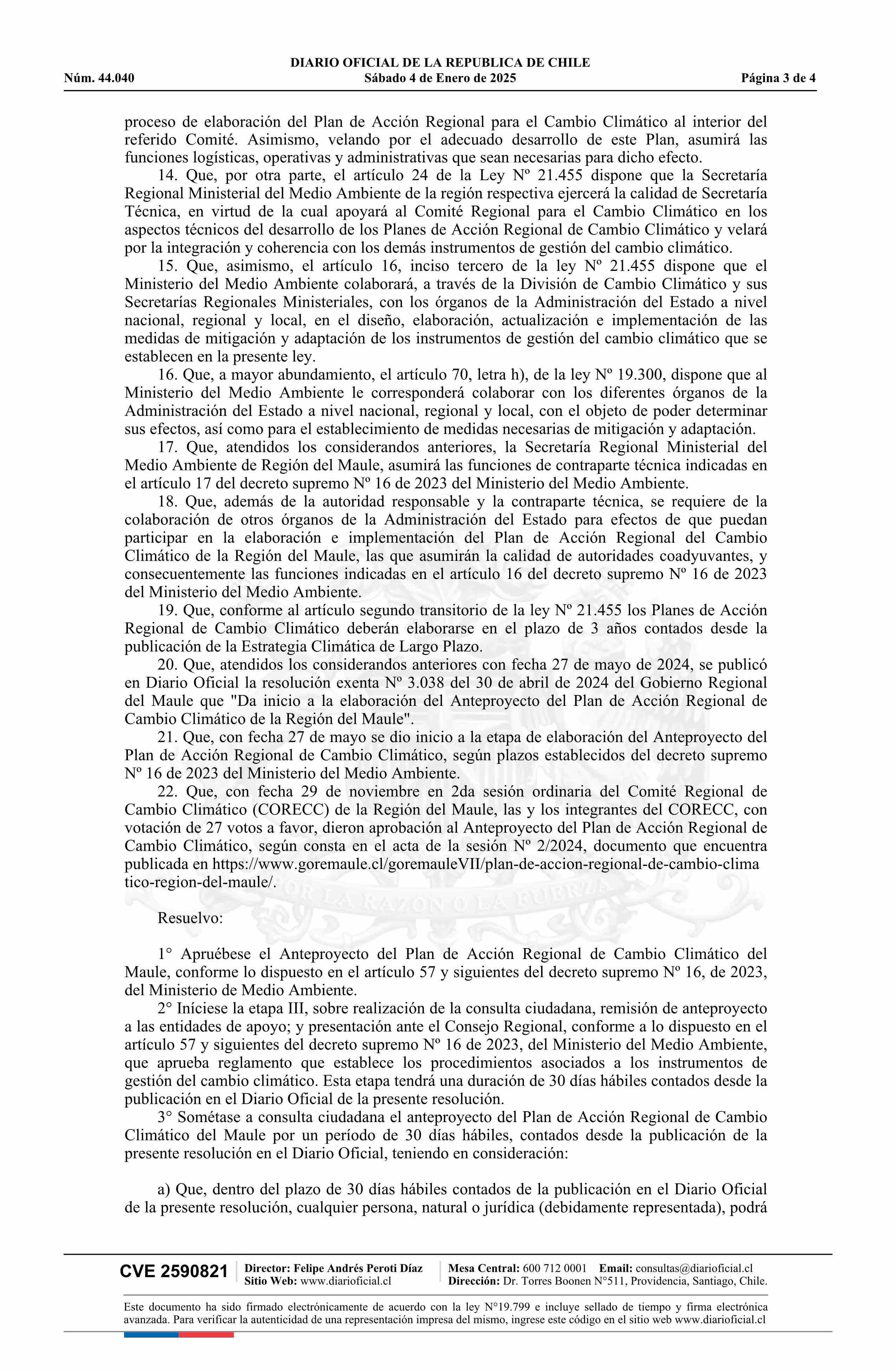 Resolución exenta número 10.753, de 2024.- Aprueba el anteproyecto del Plan de Acción Regional de Cambio Climático de la Región del Maule 04-01-2025 DIARIO OFICIAL CHILE - BOLETÍN OFICIAL DE MINERÍA |