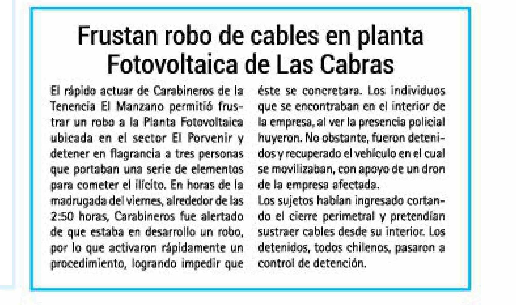 | Título: | Frustran robo de cables en planta Fotovoltaica de Las Cabras |