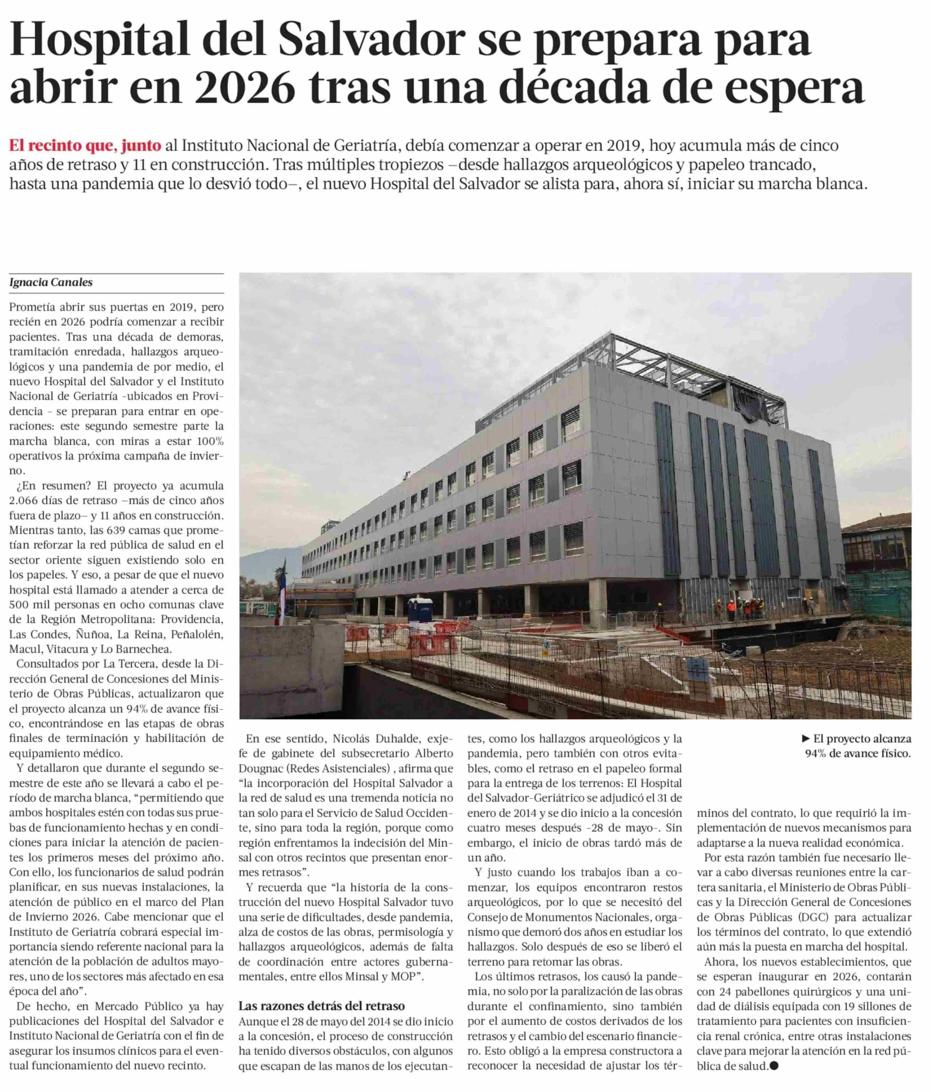 Hospital del Salvador se prepara para abrir en 2026 tras una década de espera 16-04-2025 La Tercera |