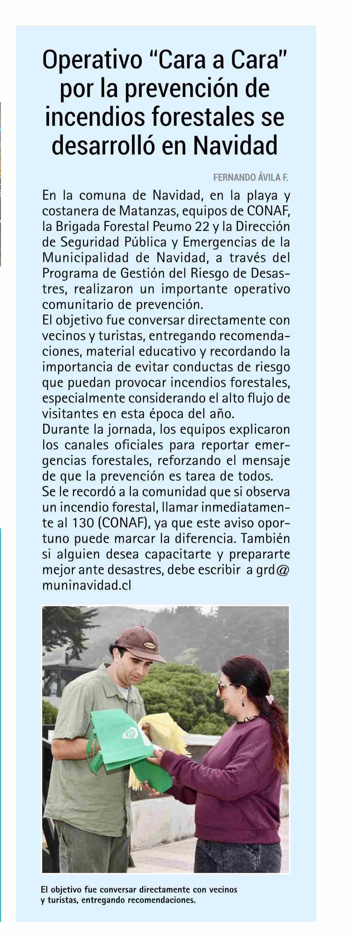 Operativo “Cara a Cara" por la prevención de incendios forestales se desarrolló en Navidad 23-02-2026 El Rancagüino |