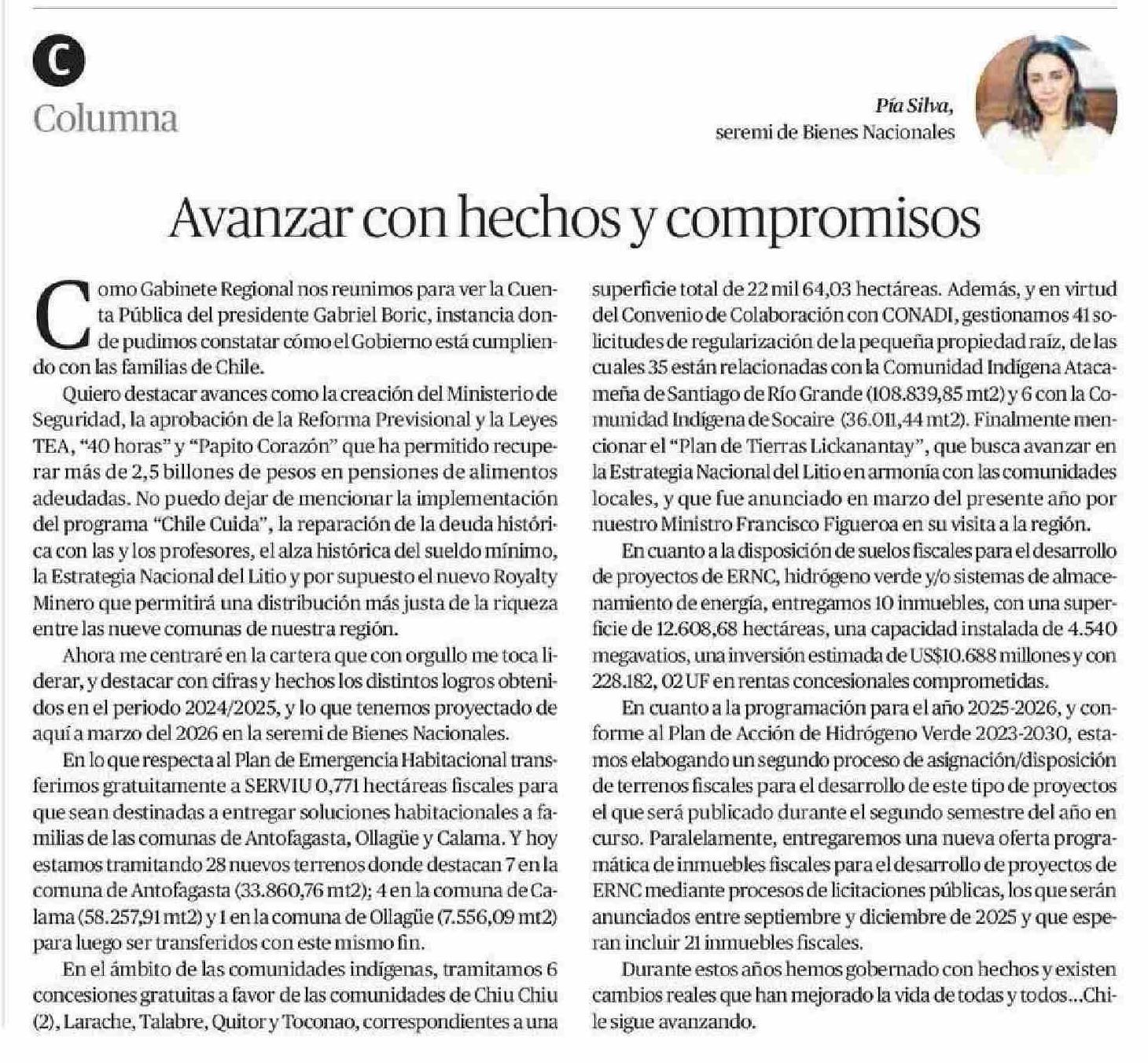 Columnas de Opinión: Avanzar con hechos y compromisos 09-06-2025 El Mercurio de Calama |