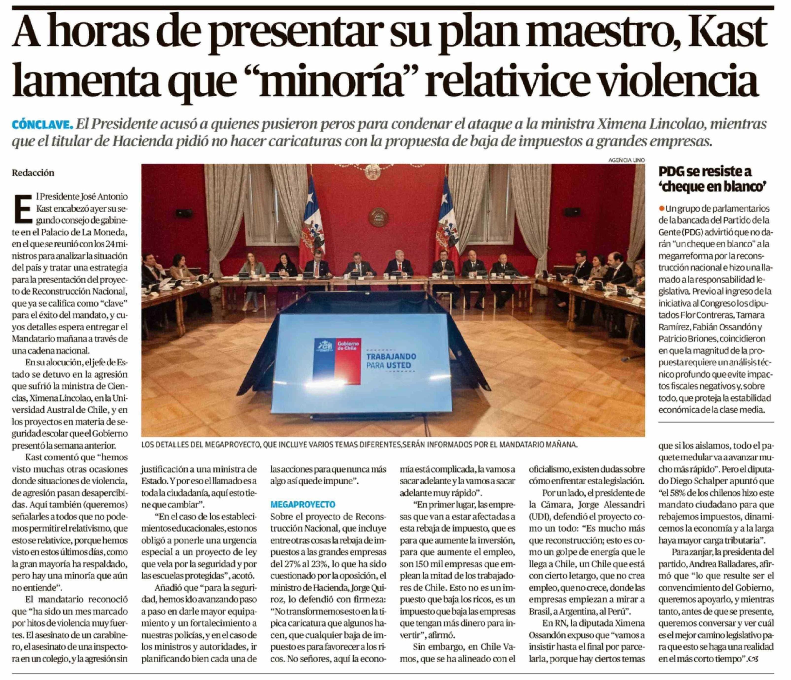 Título: A horas de presentar su plan maestro, Kast lamenta que "minoría" relativice violencia