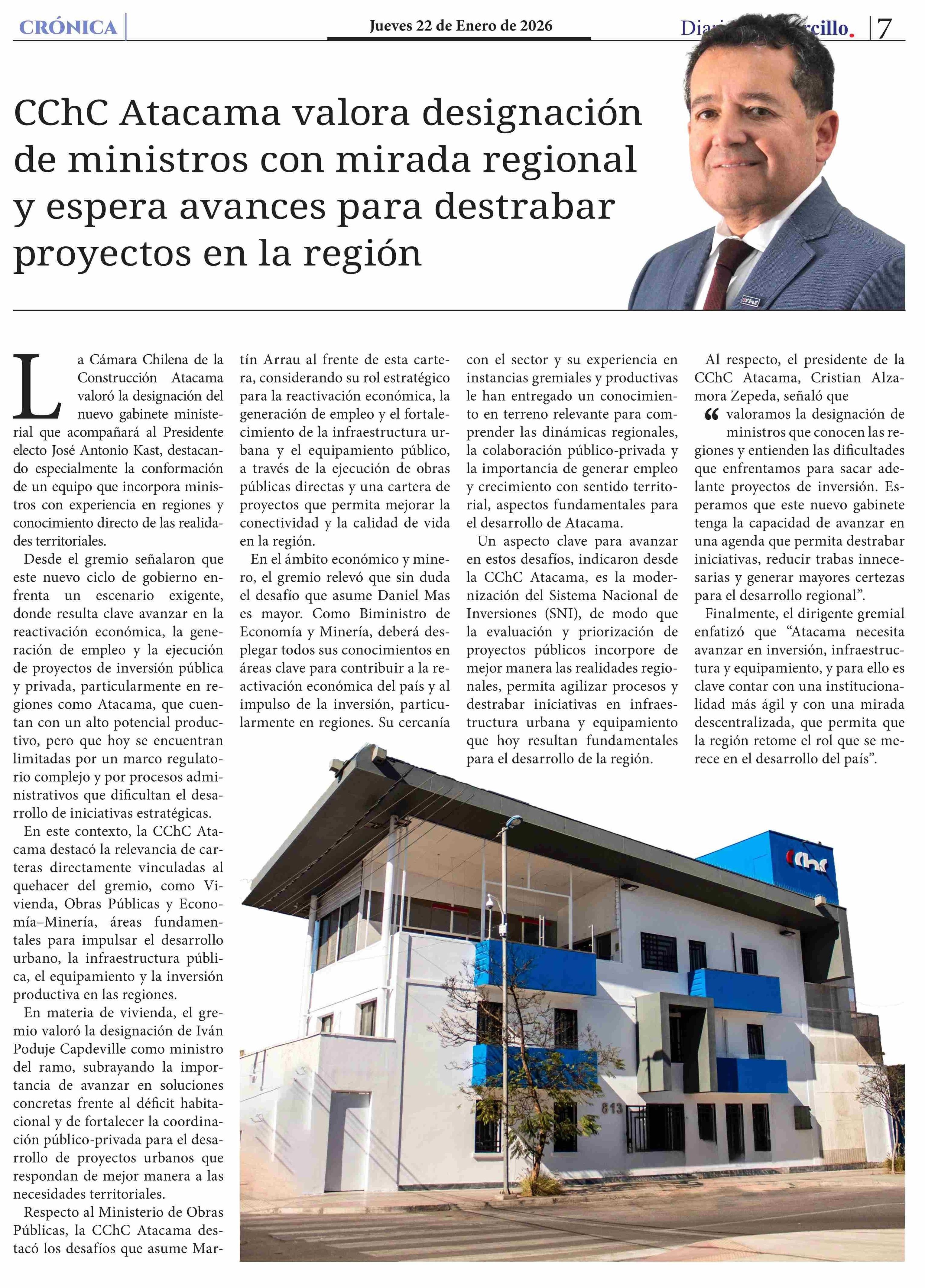 Título: CChC Atacama valora designación de ministros con mirada regional y espera avances para destrabar proyectos en la región