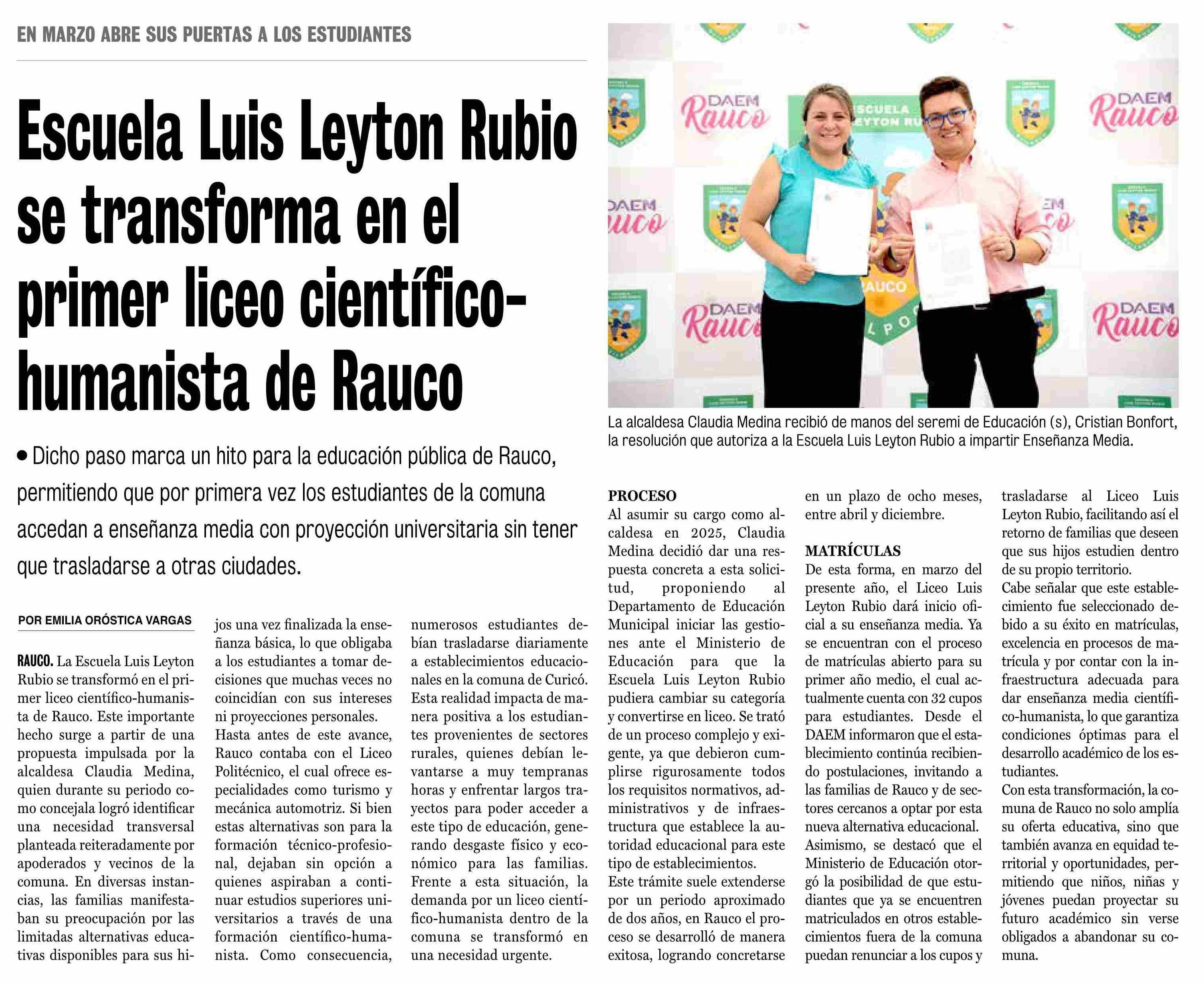 Escuela Luis Leyton Rubio se transforma en el primer liceo científicohumanista de Rauco 22-01-2026 La Prensa de Curicó |