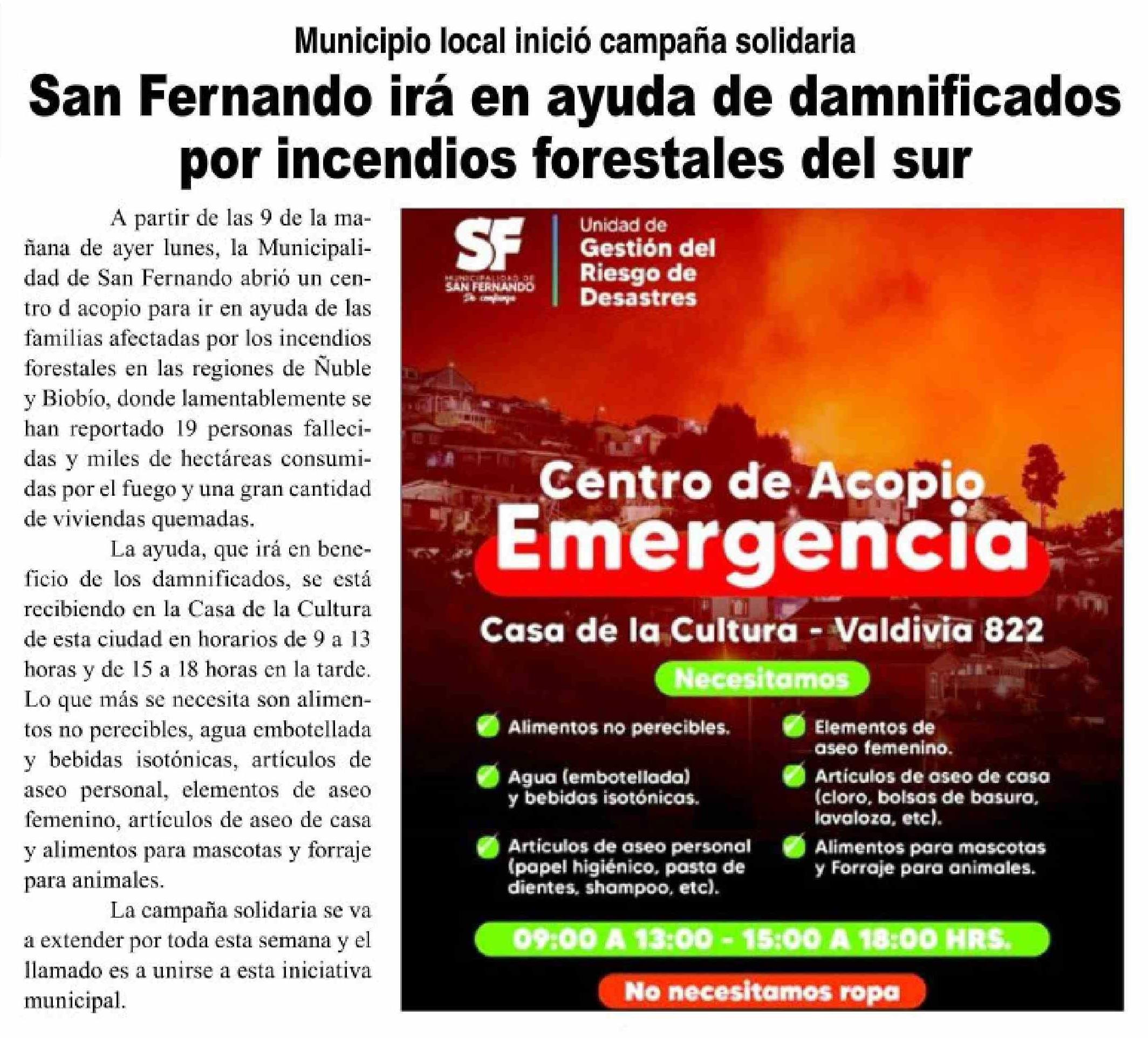 San Fernando irá en ayuda de damnificados por incendios forestales del sur 20-01-2026 Diario VI Región |