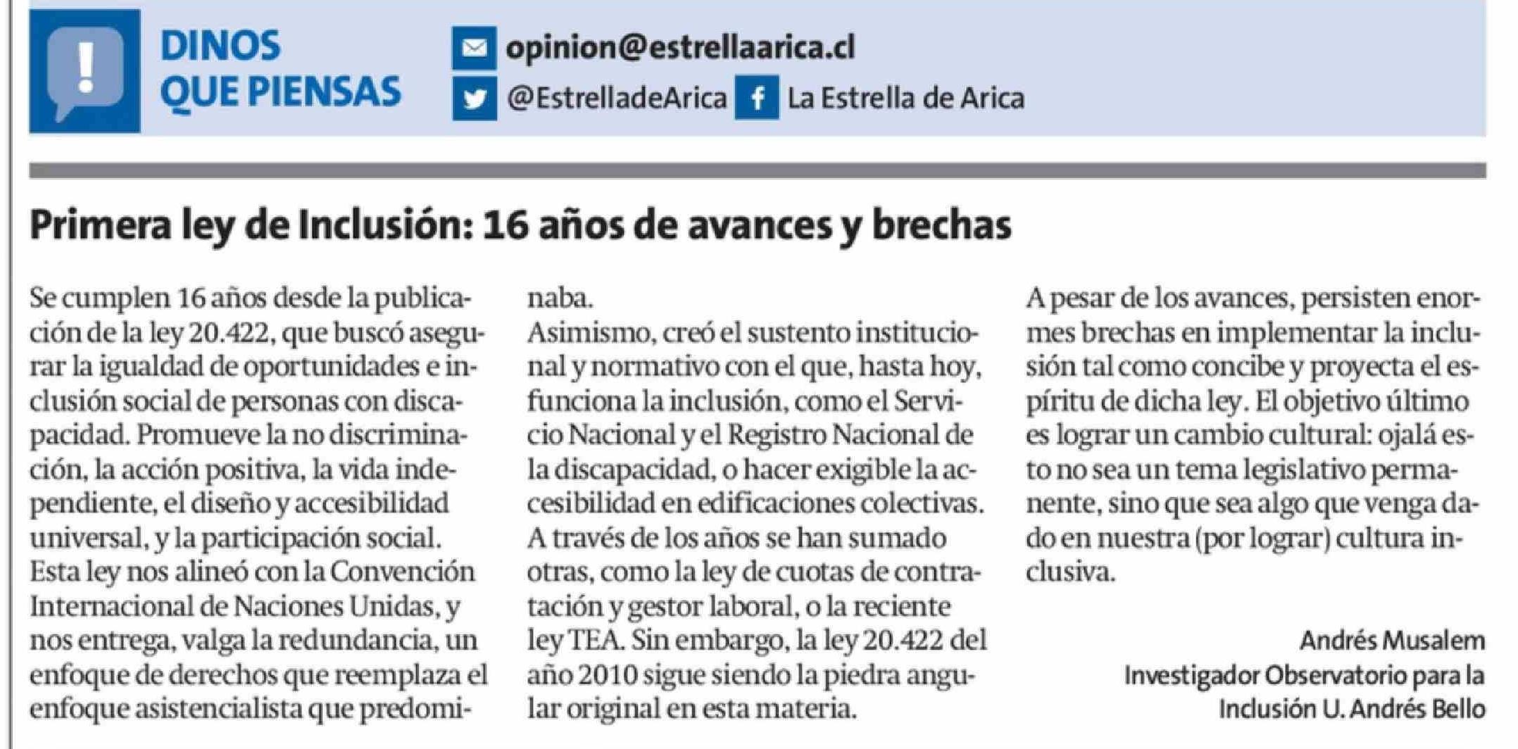 Primera ley de Inclusión: 16 años de avances y brechas 14-02-2026 La Estrella de Arica |