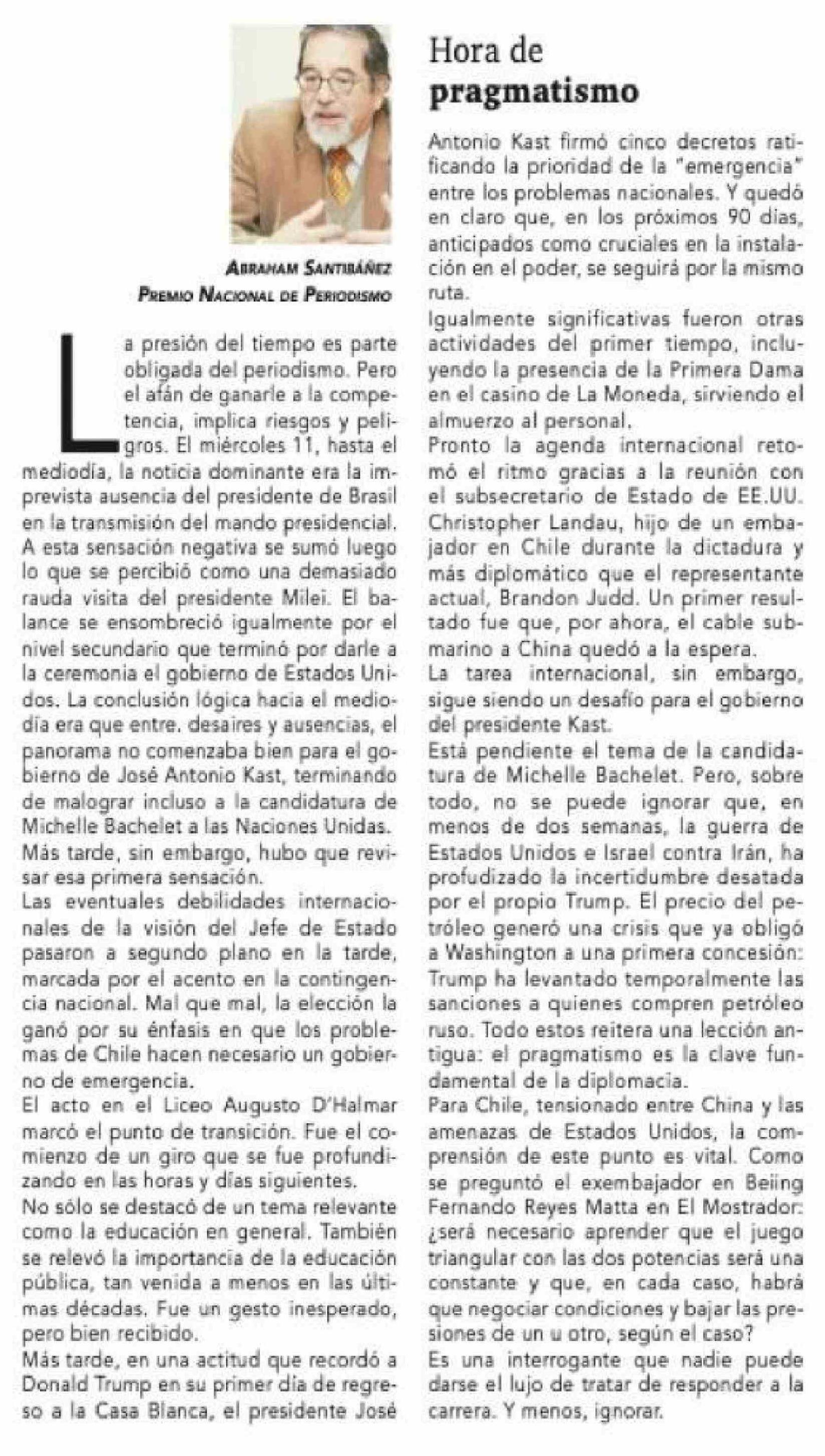 Columnas de Opinión: Hora de pragmatismo 16-03-2026 La Prensa Austral |
