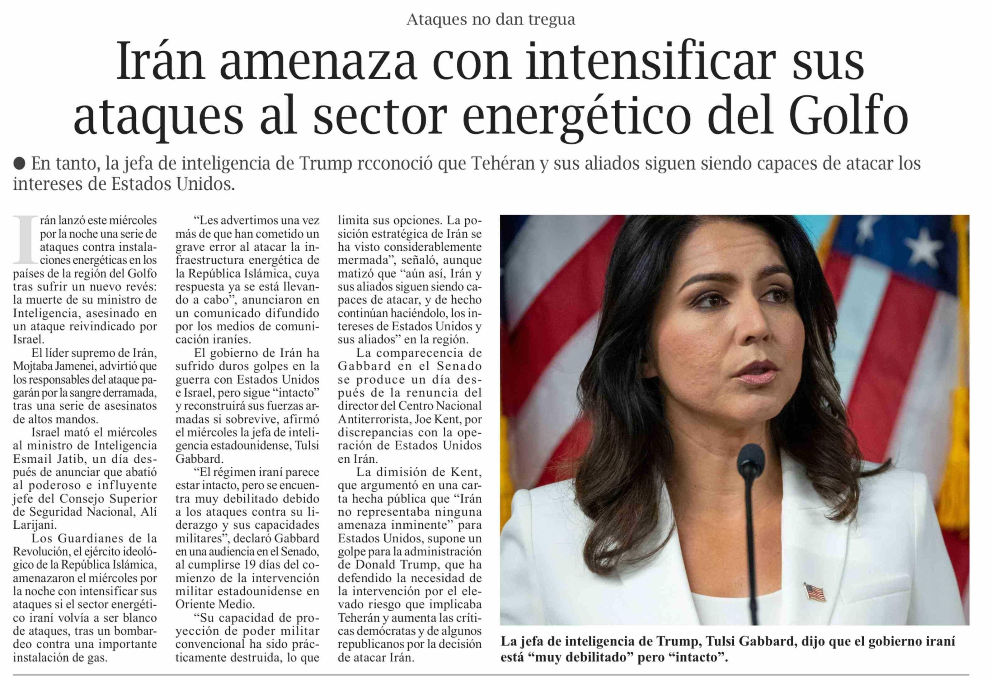 Título: Irán amenaza con intensificar sus ataques al sector energético del Golfo