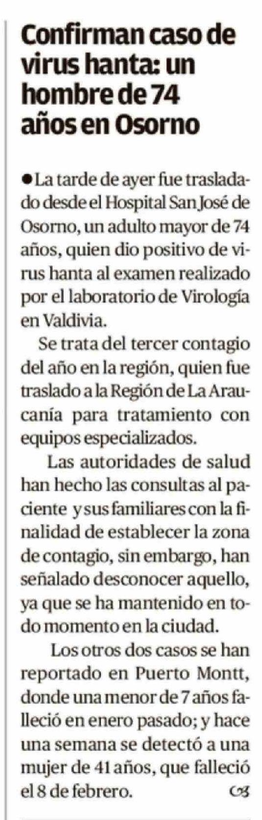 | Título: | Confirman caso de virus hanta: un hombre de 74 años en Osorno |