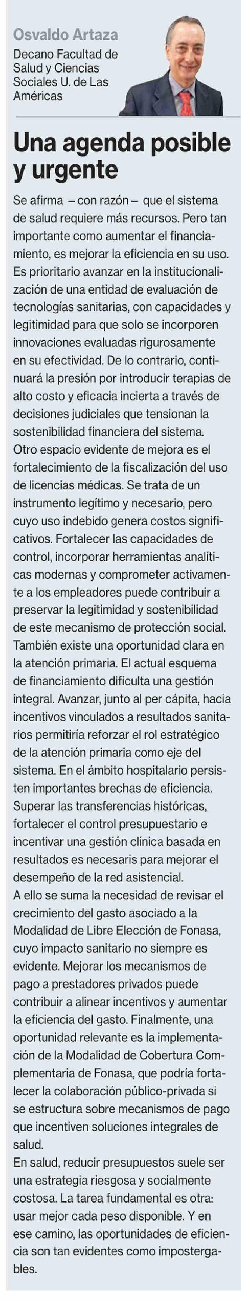 Columnas de Opinión: Una agenda posible y urgente 11-03-2026 La Segunda |