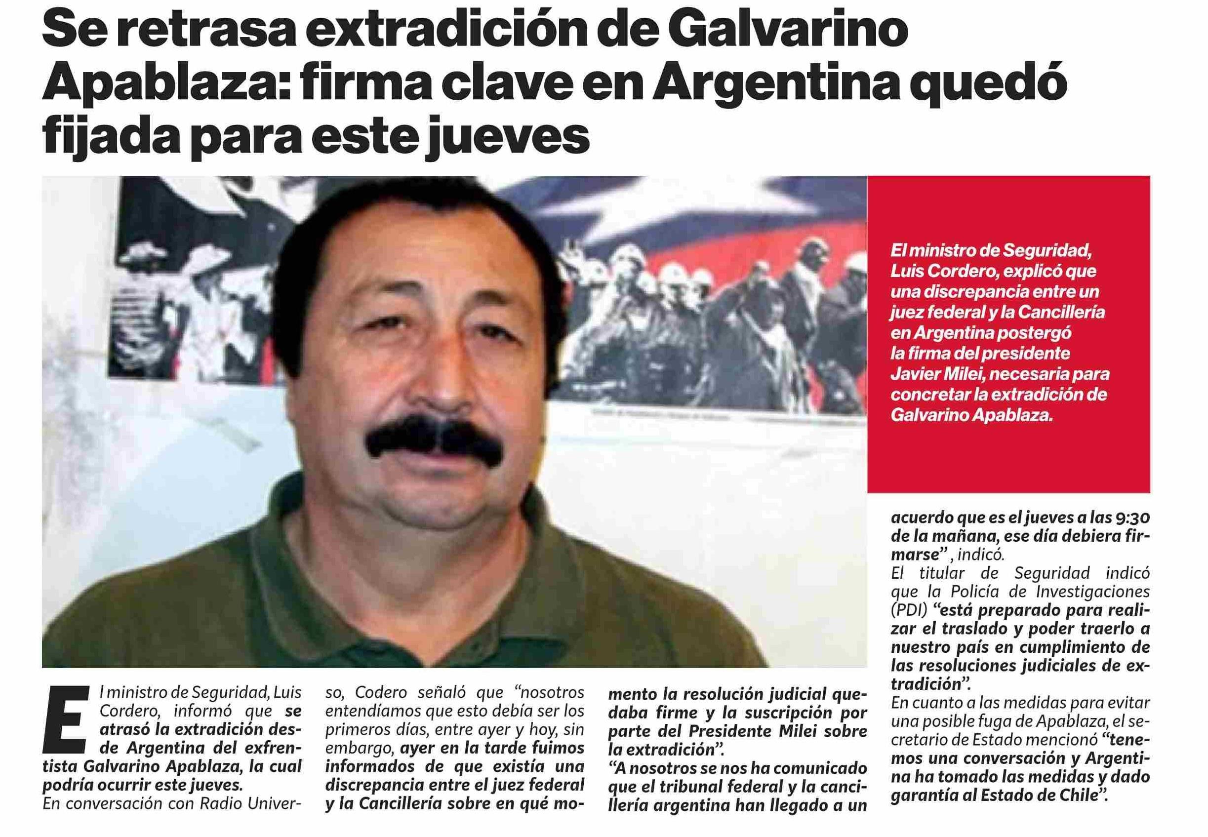 | Título: | Se retrasa extradición de Galvarino Apablaza: firma clave en Argentina quedó fijada para este jueves |